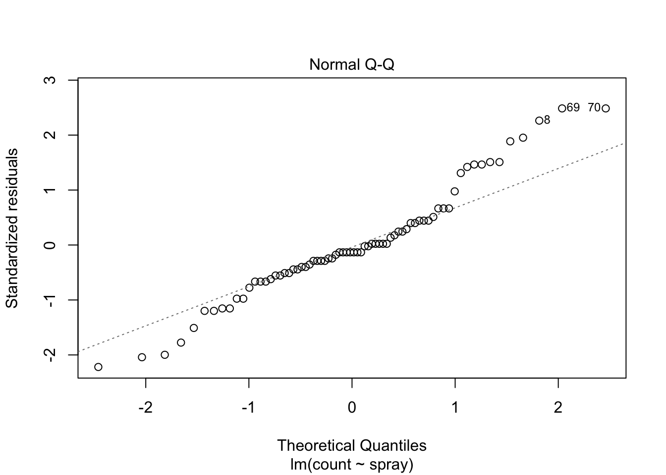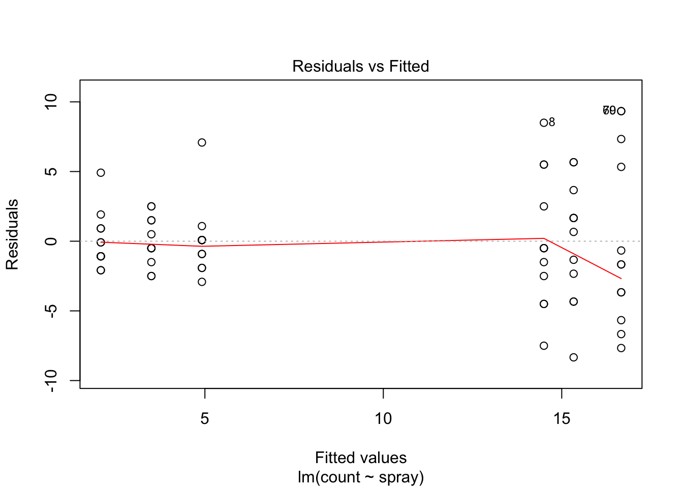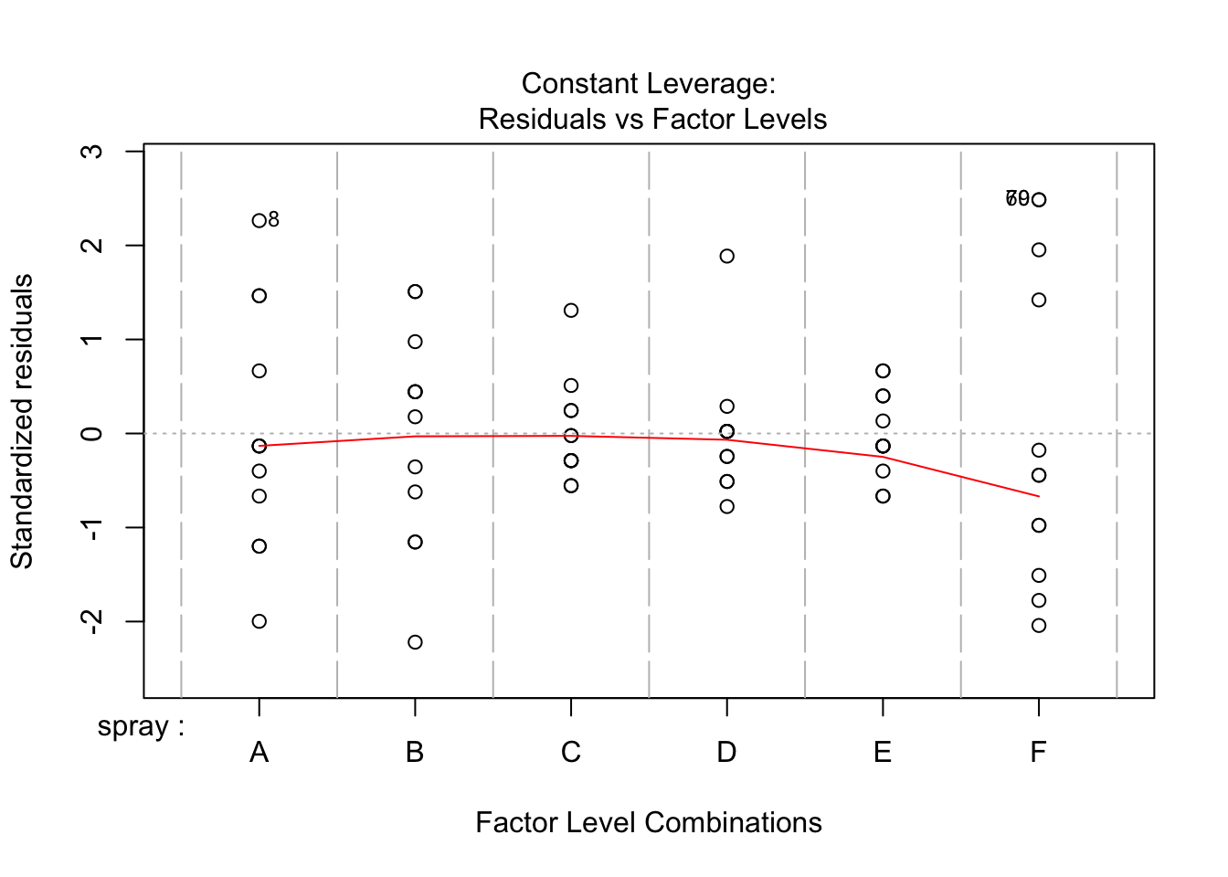 However, it is also clear from the boxplot that the assumption of equal variances is violated. The three effective sprays C, D, and E, have visibly less variance than the other three sprays. In this example, the sprays with smaller counts have smaller variance. This phenomenon is known as heteroskedacity, and is fairly common. The residual plots show it well, especially the Scale-Location plot