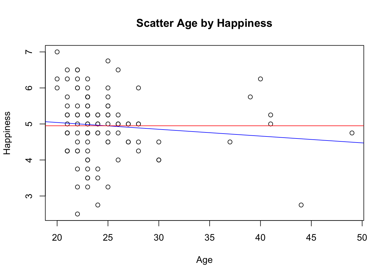 abline(lm(Happy$HappyScale~Happy$Age), col="blue")