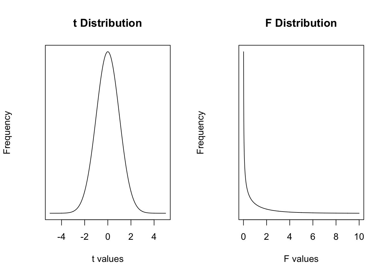 Here are two examples of these theoretical distributions with the corresponding frequency for the t and F values plotted in the \(X\) axis is given in the \(Y\) axis. Probabilities (i.e., likelihood) in density functions like these are given by areas (i.e., specific intervals of t and F values).