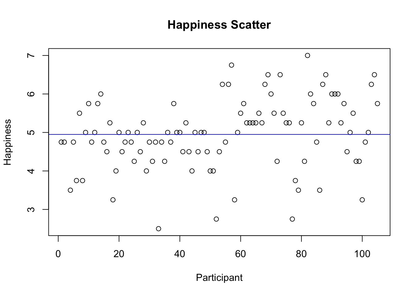 abline(h=(mean(Happy$HappyScale)), col="blue") # Plot constant in the scatter
