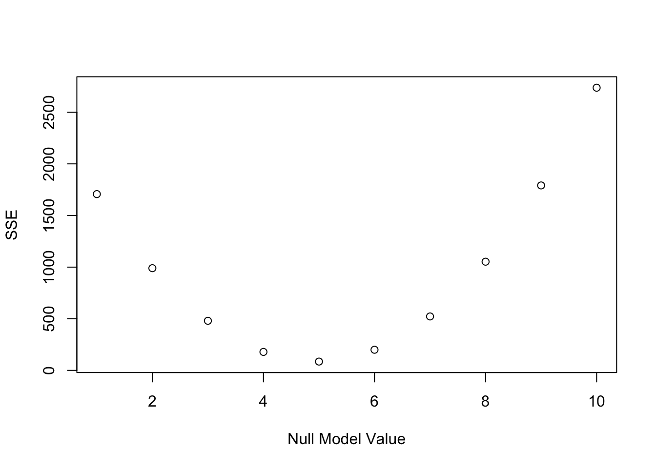 See bellow the SSE for possibles values of the null model. As expected, the model with lower SSE is the one with 4.9495192.
