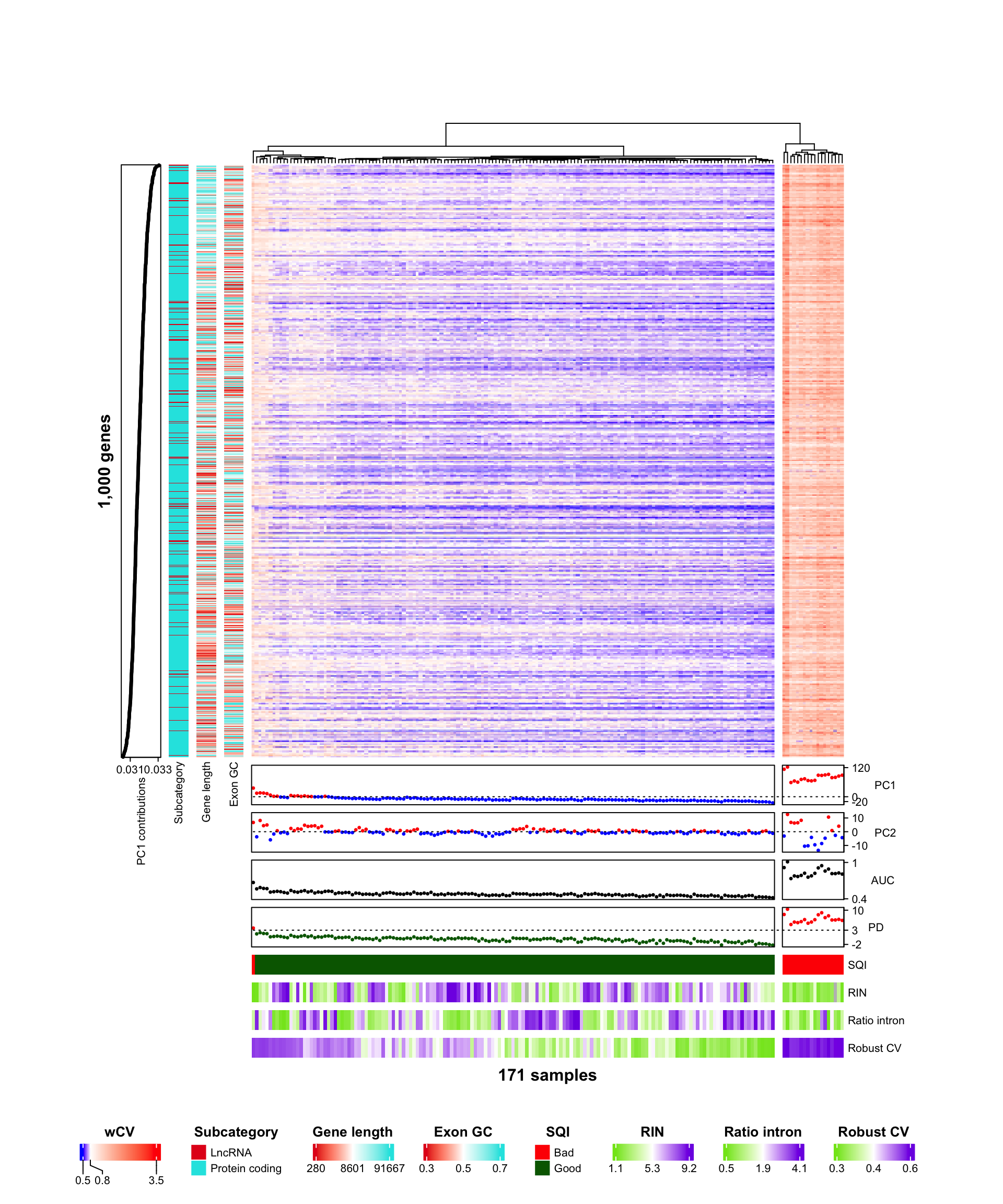 table1(~ AUC + PD + RINs + RatioIntron + robustCV | SQI,