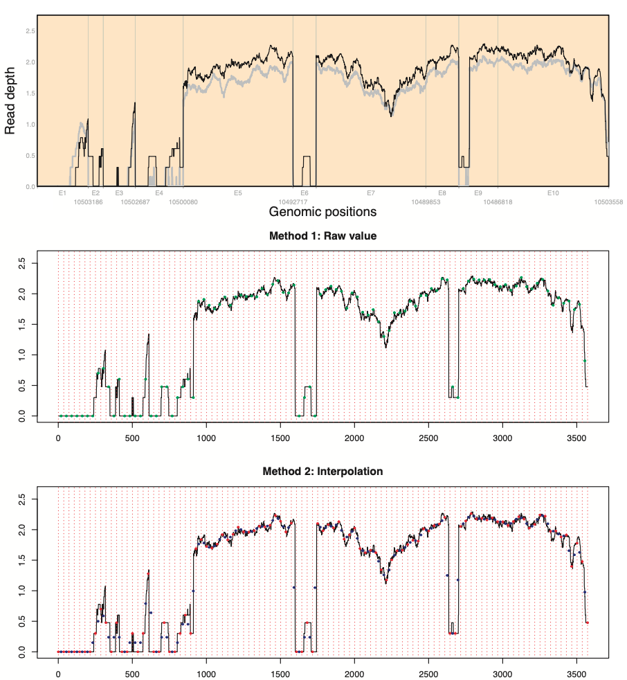 norm_pileup.* functions have two options to select read depth at the region: raw value and interpolation.