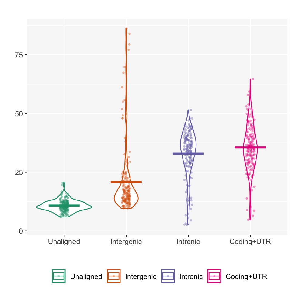 Since the transcriptome coverage directly affects the accuracy of vital features of all gene expression studies2, it may be informative to compare the coverage distribution of reads mapped in unaligned (unmapped bases), intergenic, intronic, and exonic/protein coding and UTR regions by RNA-seq platform.