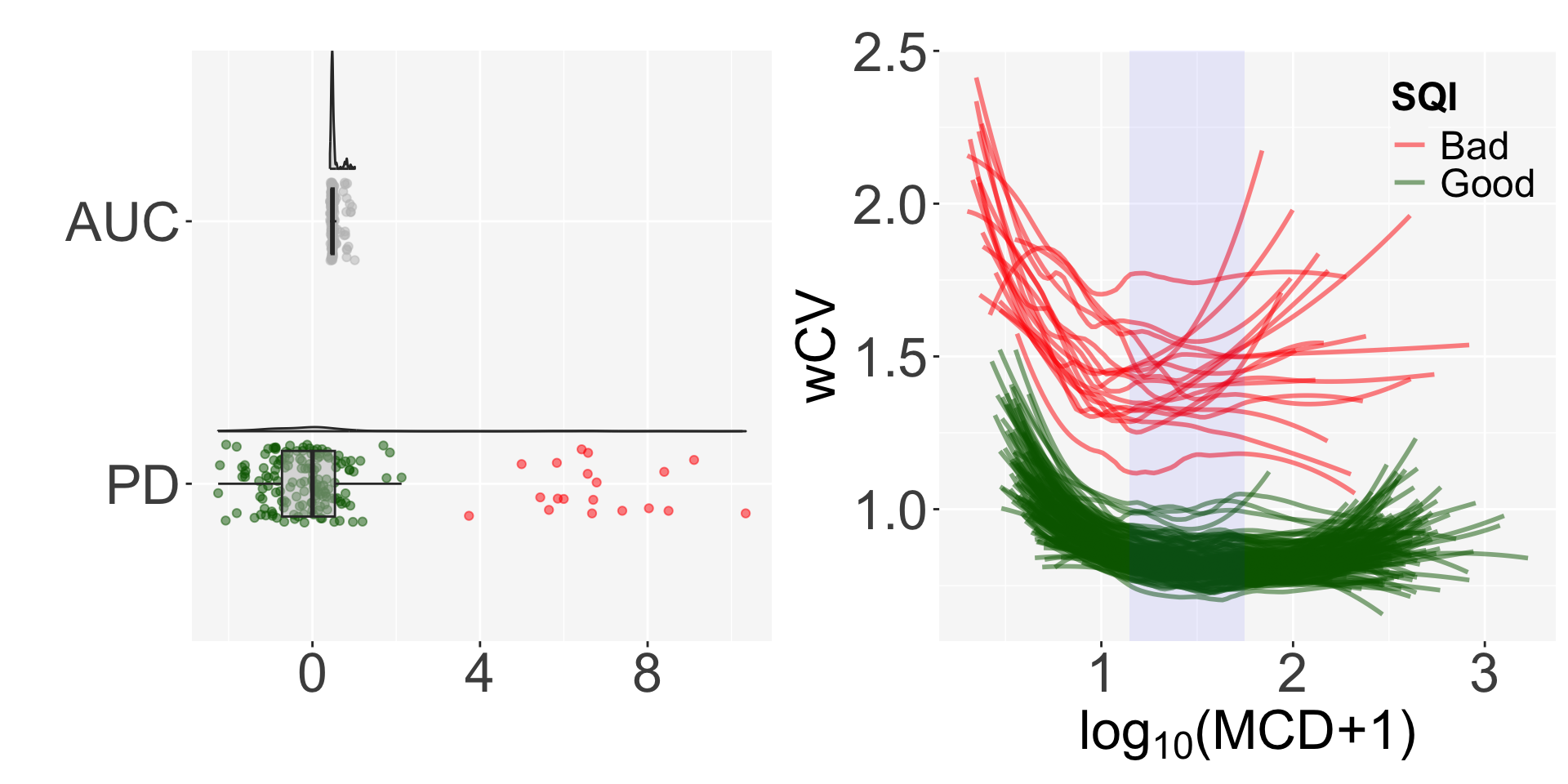 The SQI plot shows the distribution of AUC and PD and the shape of the regression by sample quality.