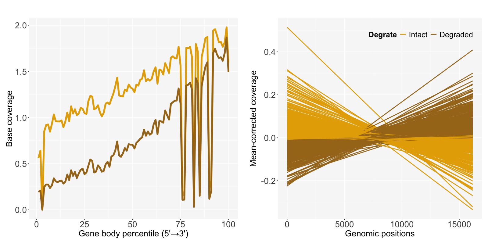 Degrate is defined as Intact or Degraded based on the median of decayRate to compare the degradation effect in base coverage. The degraded samples having relatively larger slopes show lower coverage.