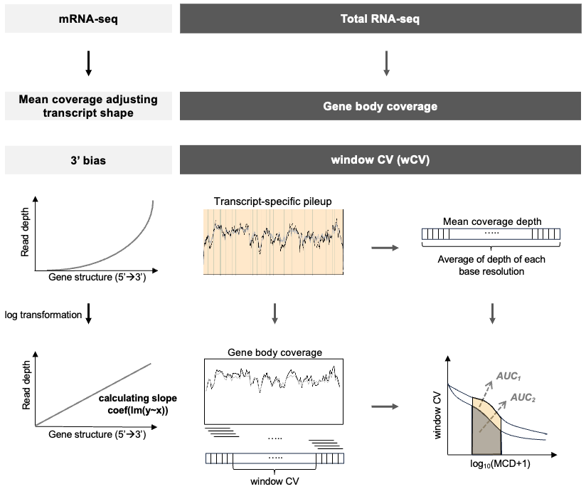 In our package, we propose a novel approach sample quality index (SQI) based on window coefficient of variation (wCV) to assess RNA-seq data quality for total RNA-seq and FFPE samples.