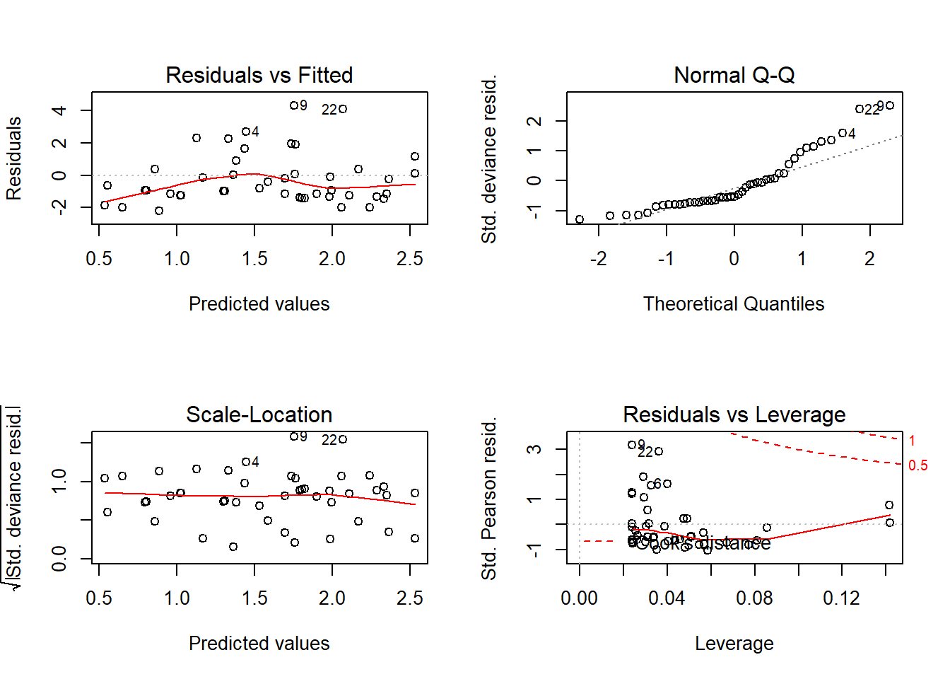 Ja no tenim una distribució de residus tan dolenta, sobretot ha millorat molt el gràfic que mostra si tenim homogeneïtat de variàncies. El de la Normalitat també ha millorat una miqueta. Tot indica que el glm amb la correcció s’ajusta millor a les dades que una RLS.