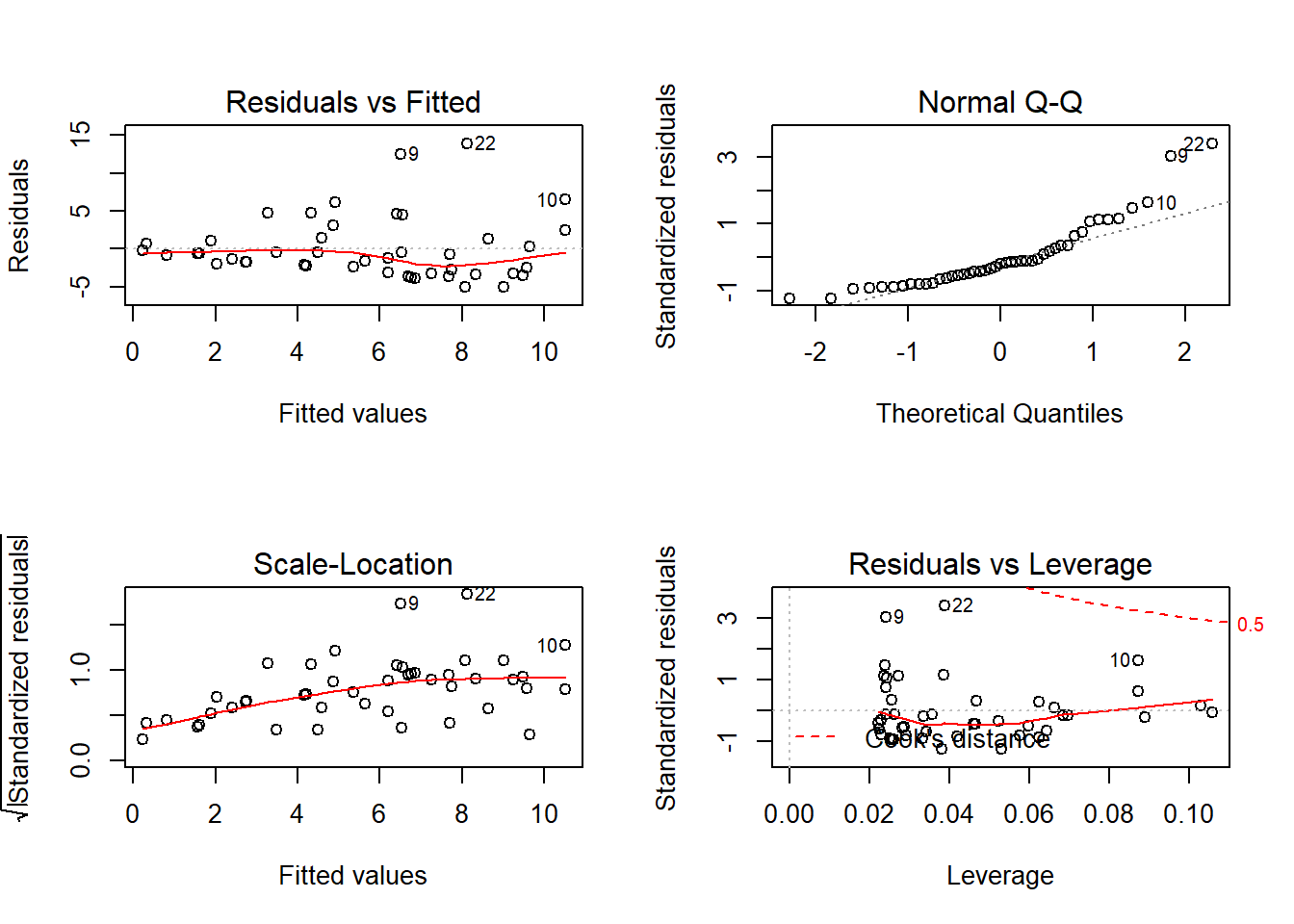 Ja no tenim una distribució de residus tan dolenta, sobretot ha millorat molt el gràfic que mostra si tenim homogeneïtat de variàncies. El de la Normalitat també ha millorat una miqueta. Tot indica que el glm amb la correcció s’ajusta millor a les dades que una RLS.
