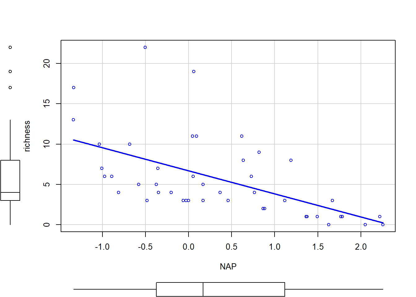 scatterplot(richness~NAP, reg.line=lm, smooth=F, spread=F, id.method='mahal', id.n = 2, boxplots='xy', span=0.5, data=richness.data)