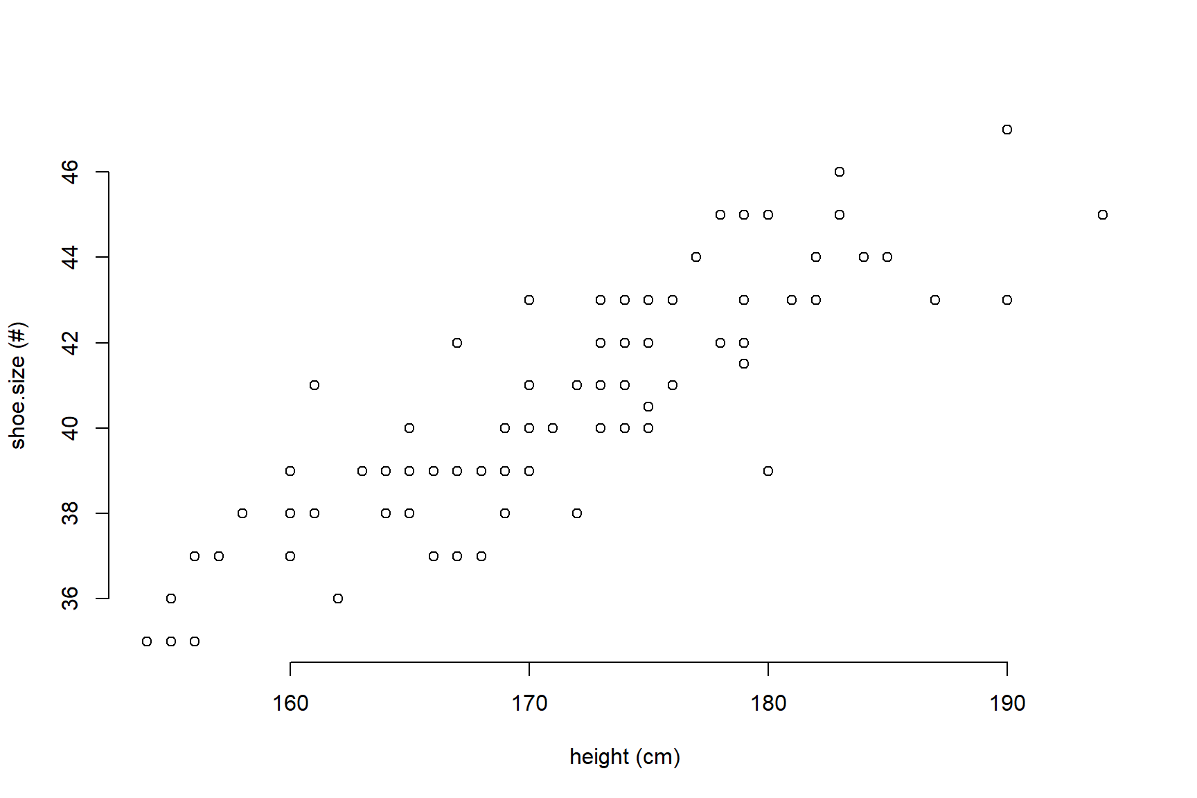 Com era d’esperar la correlació entre l’height dels i les alumnes i la seua mida de shoe.size és molt alta i positiva (i.e. 0.8680414). Es a dir, quan més alt és l’individu, major és la mida de shoe.size. Quan les variables no són normals és millor usar l’índex de correlació Spearman (i.e. method = “spearman”).