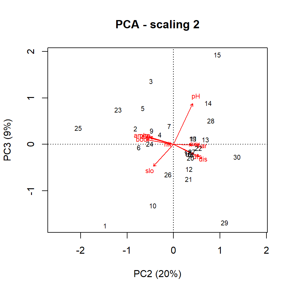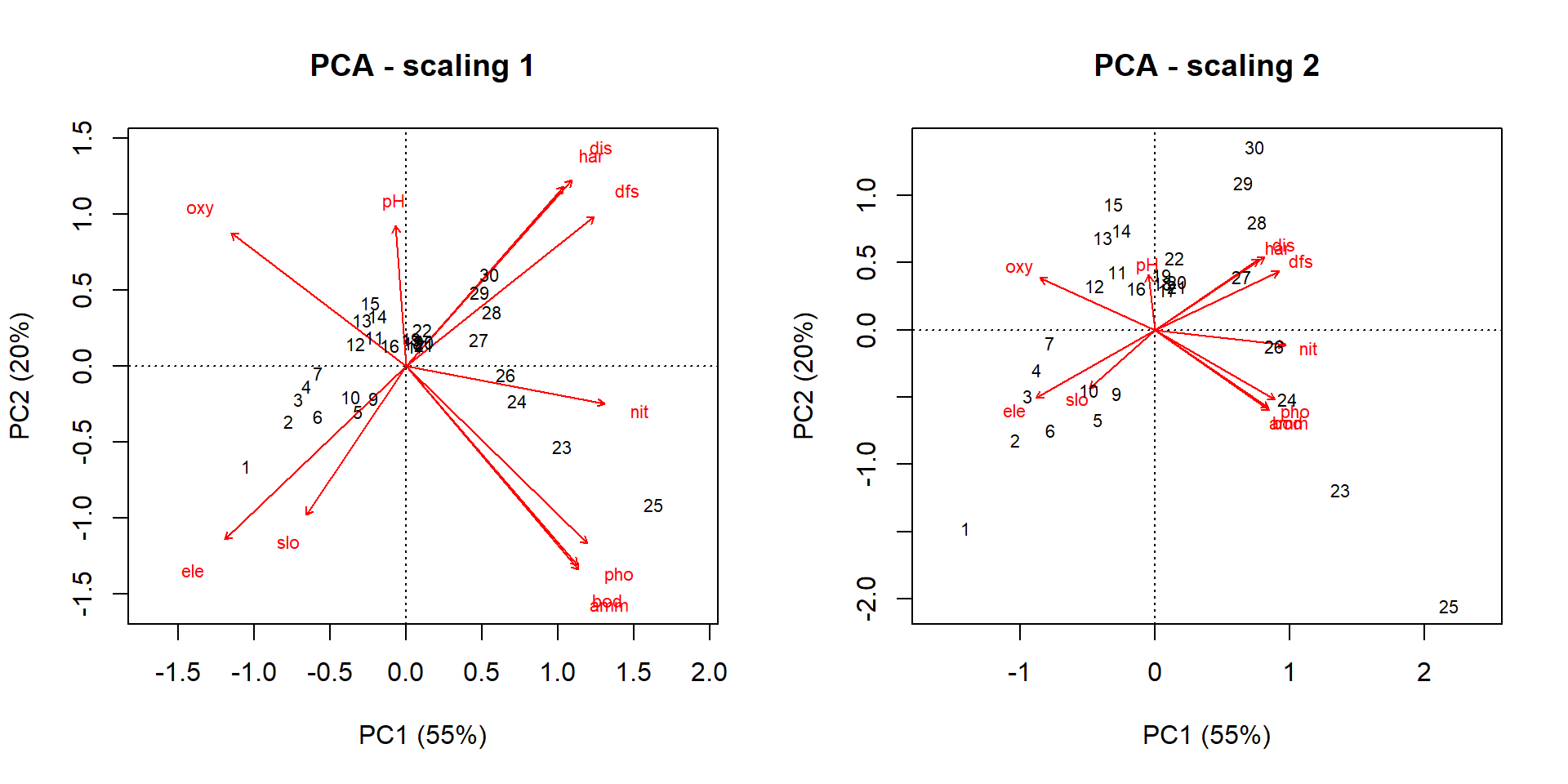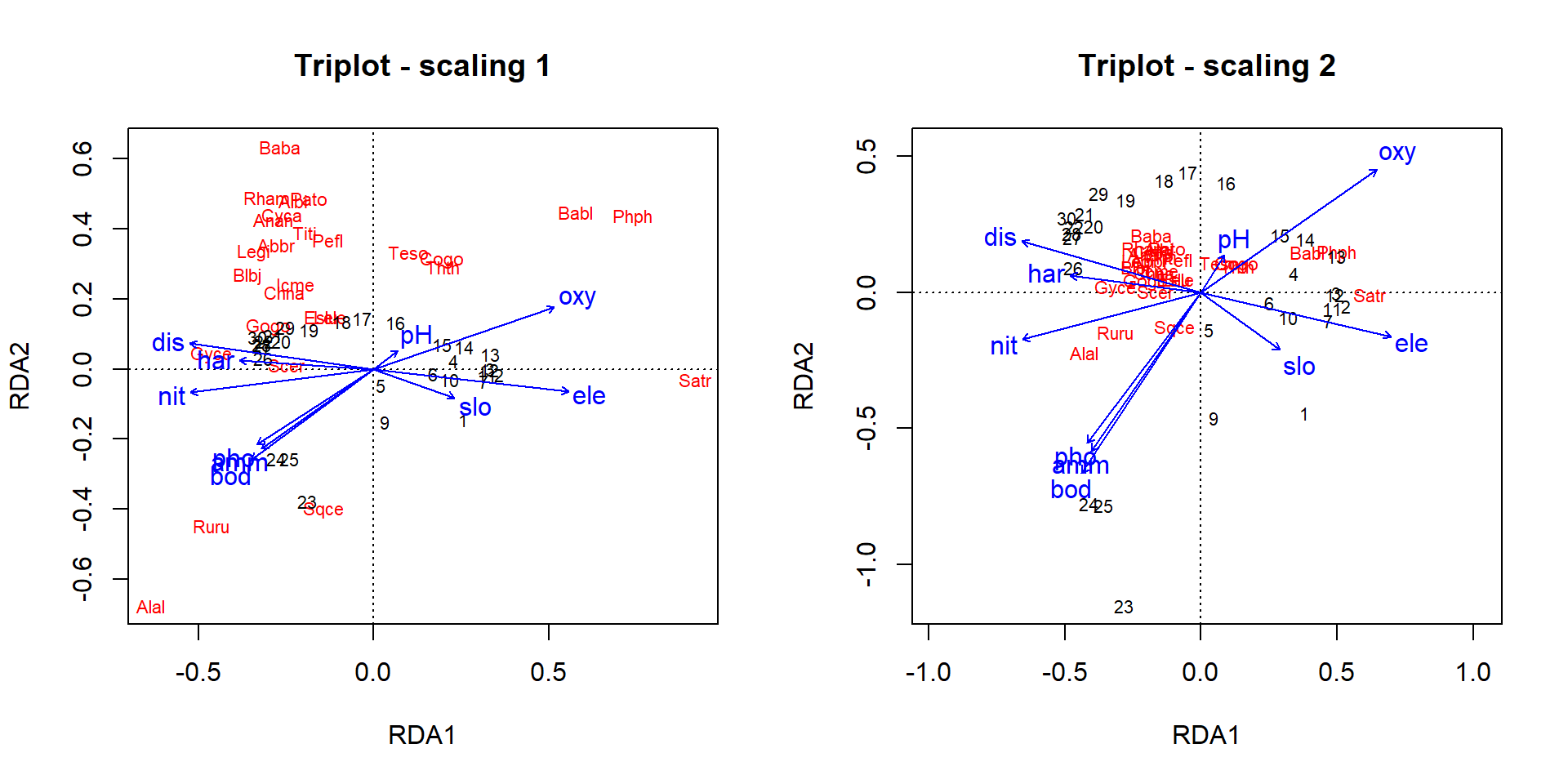 Miran els dos triplots, veiem que l’oxigen (oxy), l’altitud (ele), els nitrats (nit) i el cabal (dis) juguen un paper important en la dispersió dels llocs al llarg del primer eix canònic (RDA1). El primer eix separa clarament els cursos alt i baix del riu. El triplot de scaling 2 mostra grups d’espècies de peixos correlacionats amb diferents conjunts de variables explicatives: les espècies Satr, Babl i Phph es troben al curs alt del riu i estan correlacionades amb un alt contingut d’oxigen i una elevació i pendent elevats. Les espècies Alal, Ruru i Sqce predominen especialment els punts de mostreig 23, 24 i 25, caracteritzats per nivells elevats de fosfats (pho), amoni (amm) i demanda biològica d’oxigen (dbo). La majoria d’altres espècies predominen al curs baix del riu (punts 17-30). Fixeu-vos que estan molt agrupades i mostren projeccions als eixos RDA majoritàriament més curtes, la qual cosa indica que estan relacionades amb condicions ecològiques intermèdies.