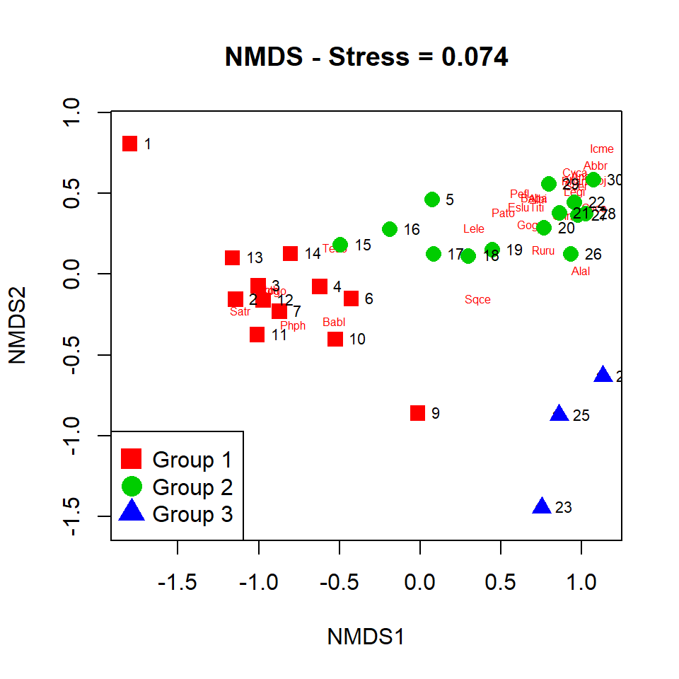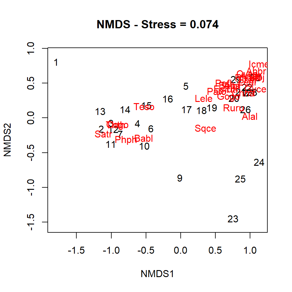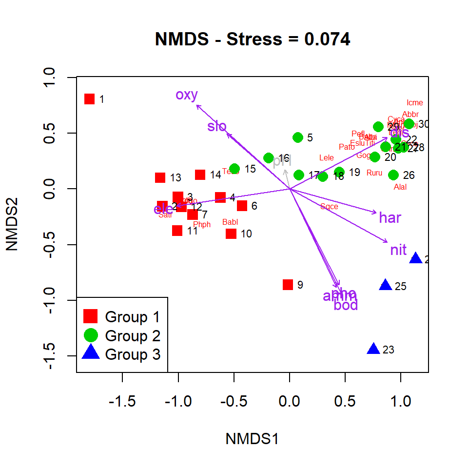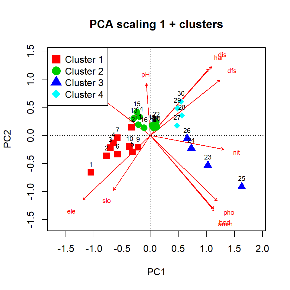 Miran els dos triplots, veiem que l’oxigen (oxy), l’altitud (ele), els nitrats (nit) i el cabal (dis) juguen un paper important en la dispersió dels llocs al llarg del primer eix canònic (RDA1). El primer eix separa clarament els cursos alt i baix del riu. El triplot de scaling 2 mostra grups d’espècies de peixos correlacionats amb diferents conjunts de variables explicatives: les espècies Satr, Babl i Phph es troben al curs alt del riu i estan correlacionades amb un alt contingut d’oxigen i una elevació i pendent elevats. Les espècies Alal, Ruru i Sqce predominen especialment els punts de mostreig 23, 24 i 25, caracteritzats per nivells elevats de fosfats (pho), amoni (amm) i demanda biològica d’oxigen (dbo). La majoria d’altres espècies predominen al curs baix del riu (punts 17-30). Fixeu-vos que estan molt agrupades i mostren projeccions als eixos RDA majoritàriament més curtes, la qual cosa indica que estan relacionades amb condicions ecològiques intermèdies.