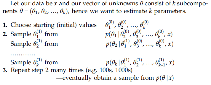 - Gibbs algorithm: splits multidimensional \(\theta\) into separate blocks, reducing dimensionality