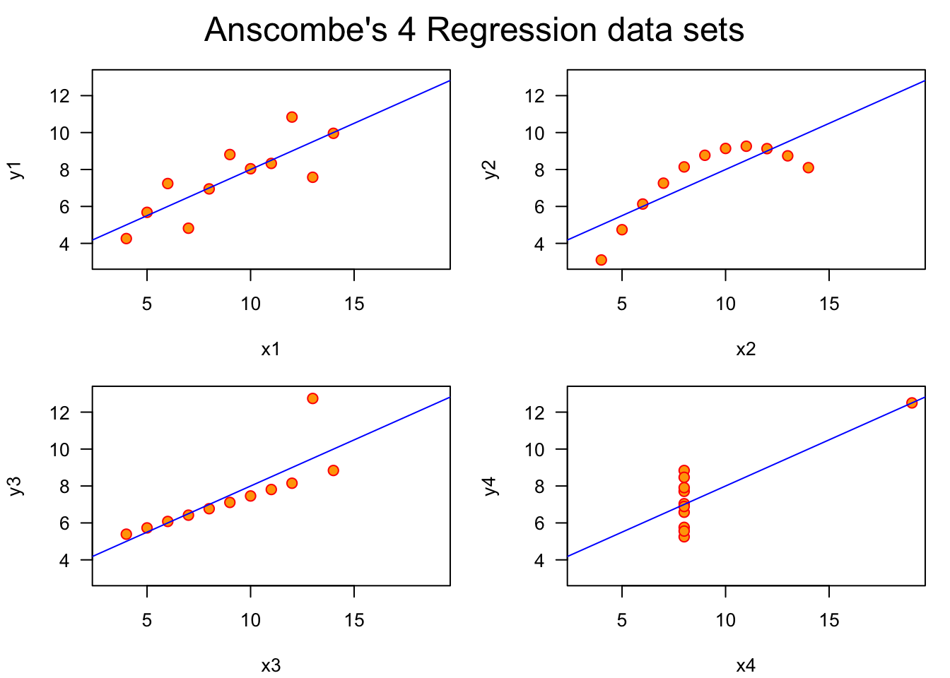 Plotting or otherwise visualizing your data can be one of the most helpful steps in understanding your data. For instance, imagine I told you that four different data sets had the virtually same means for \(x\) and \(y\), virtually the same sample variance (\(\sigma^2\)), the same correlation, and the same regression line. You would likely have a hard time visualizing four different plots of these data sets. In fact, these 4 data sets are shown below, and are referred to as Anscombe’s Quartet (Anscombe 1973).