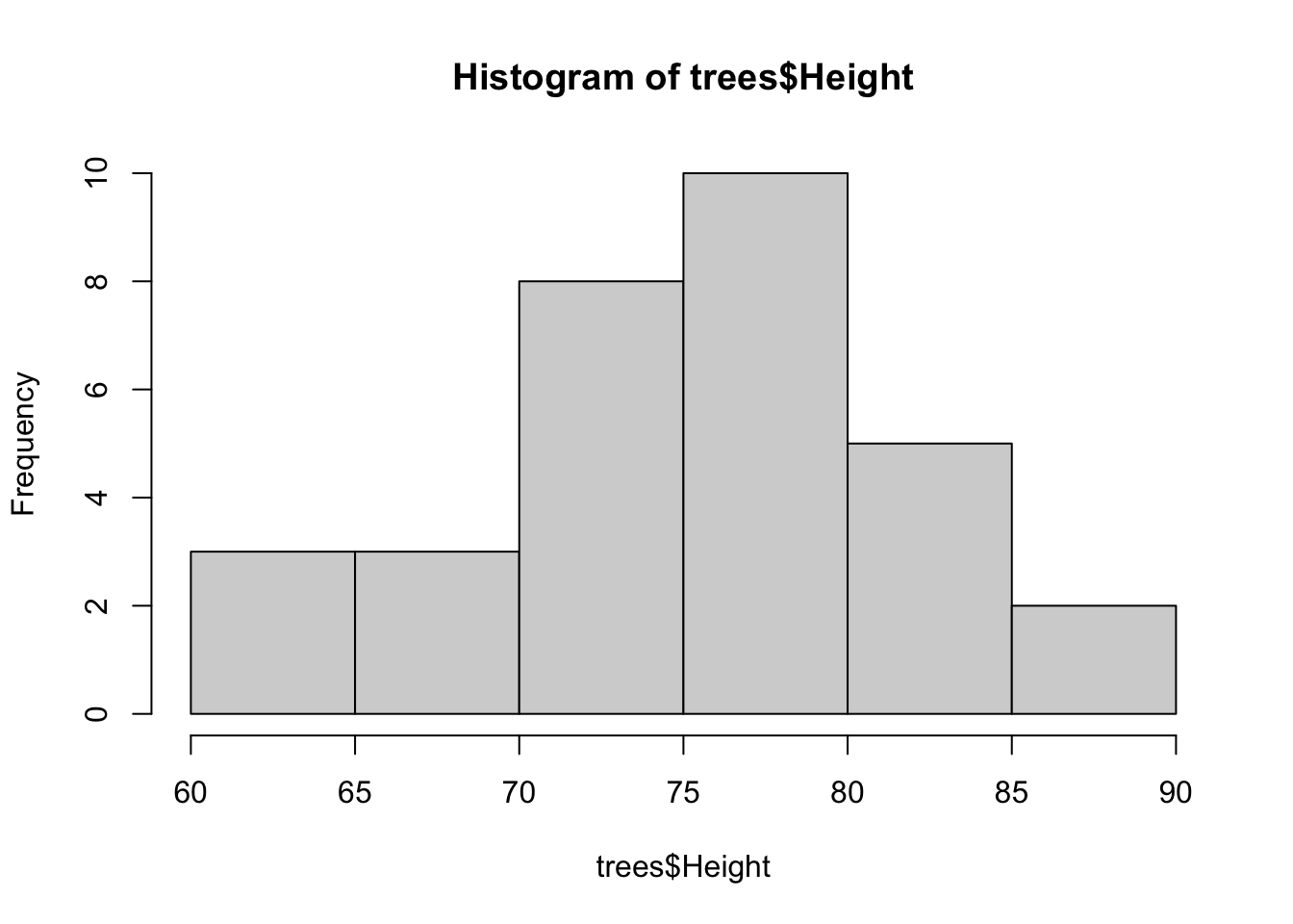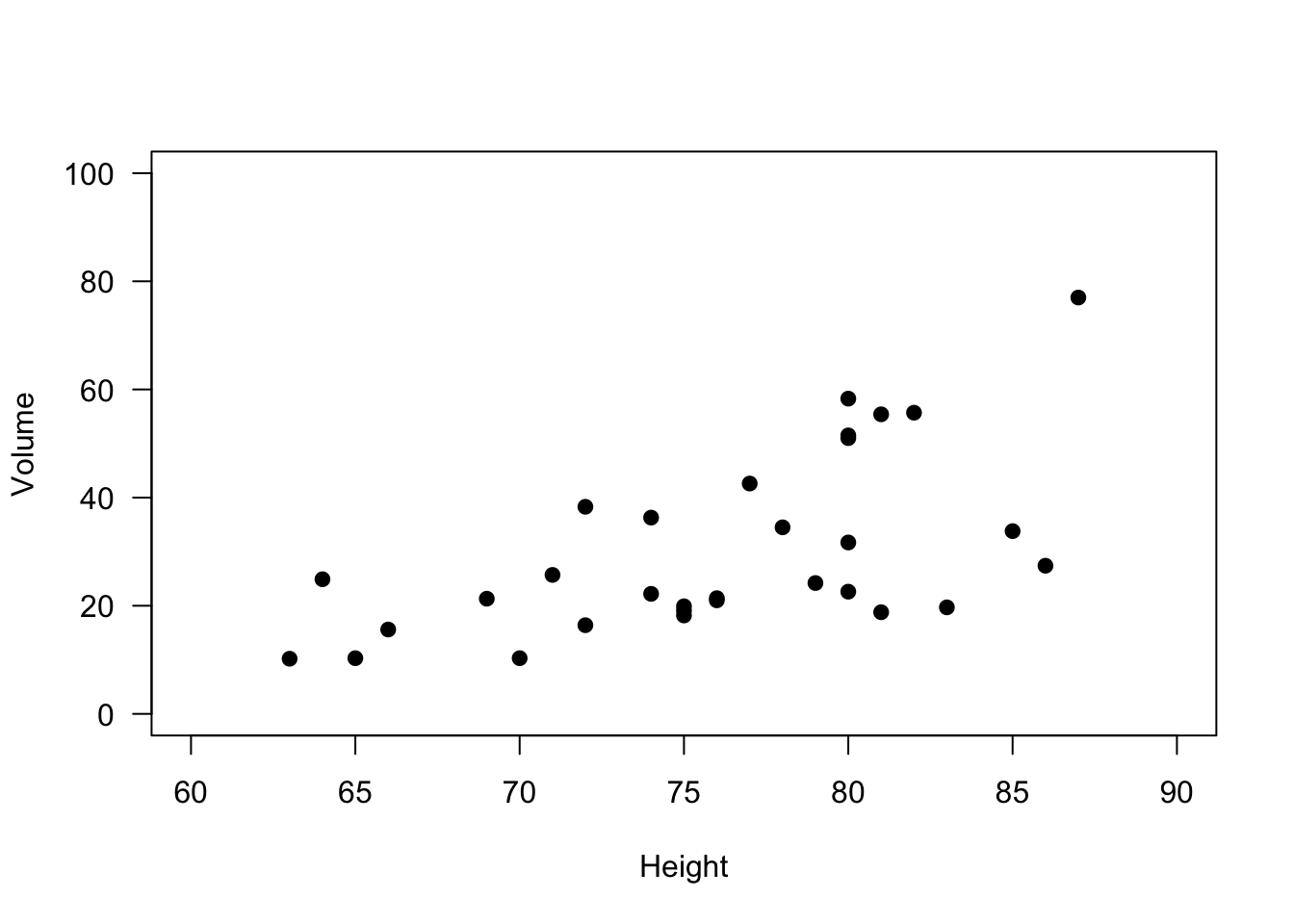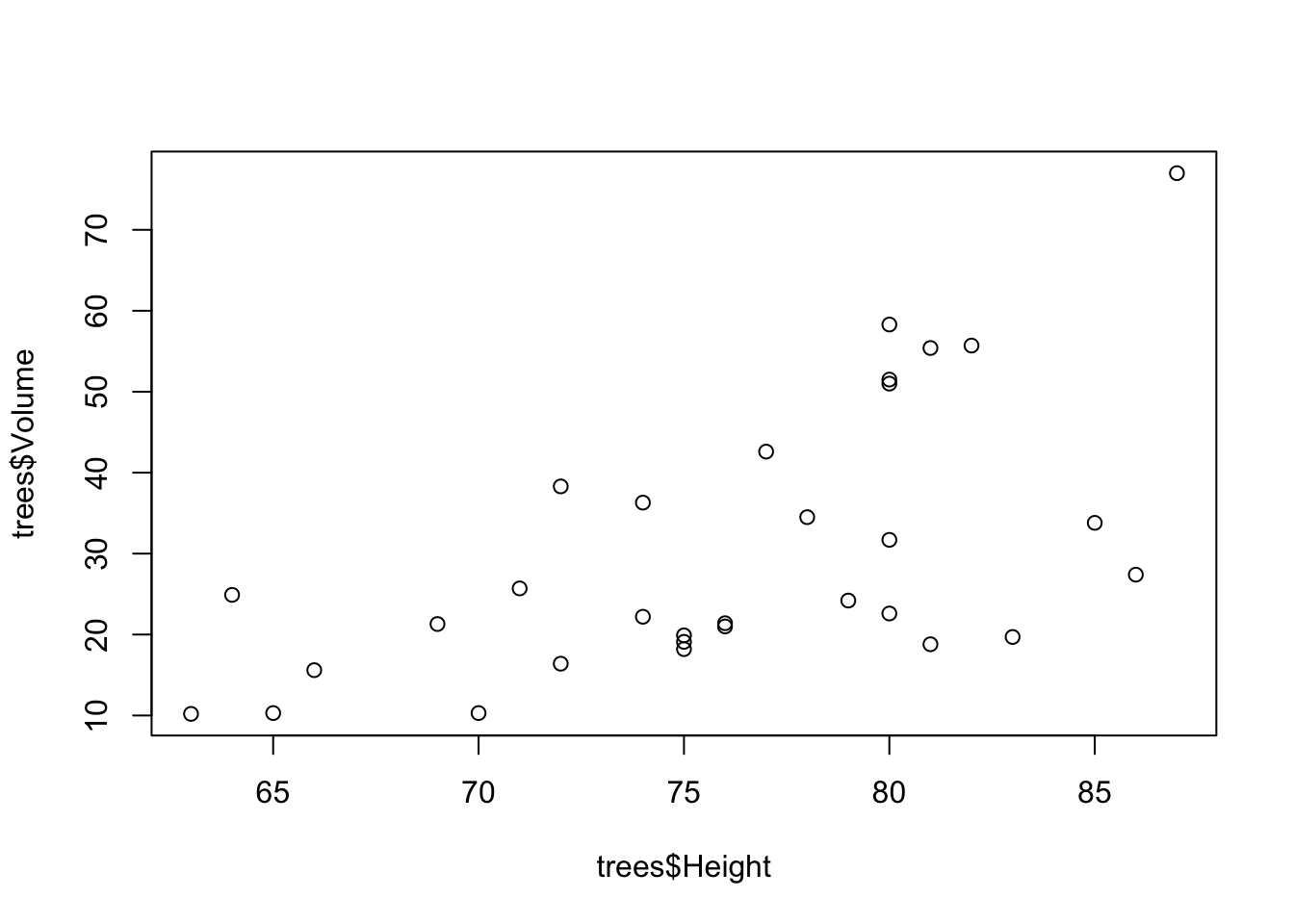 plot(trees$Volume ~ trees$Height, # The plot in formula syntax; y ~ x