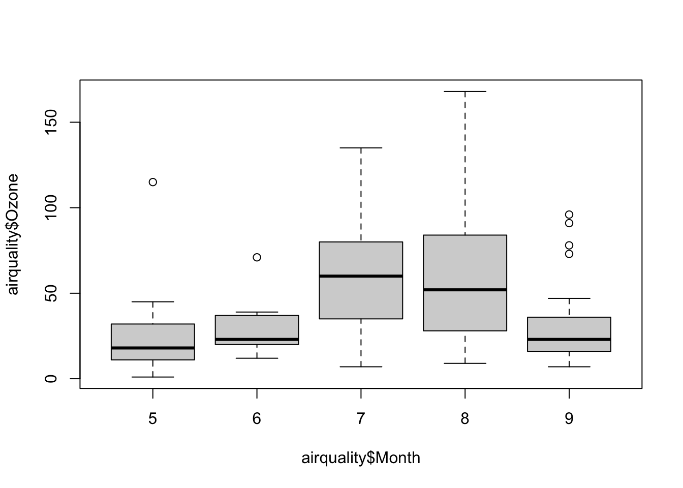 The boxplot is one of the more undervalued plots for data—both for exploratory work and final presentation. So often when bar plots are used incorrectly, it is actually a box plot that is the appropriate plot. Boxplot show distributional information for data. Typically the box represents the IQR (interquartile range), the center line represents the median, and the whiskers represent some extreme of the data. However, one mistake that is often made with boxplots is that the boxplot features are not described in the figure caption. You might not be captioning all your exploratory plots, but for final renderings, be sure to state what the box represents, what the whiskers represent, and so on. It might be obvious to you, but boxplot symbology is not universal!