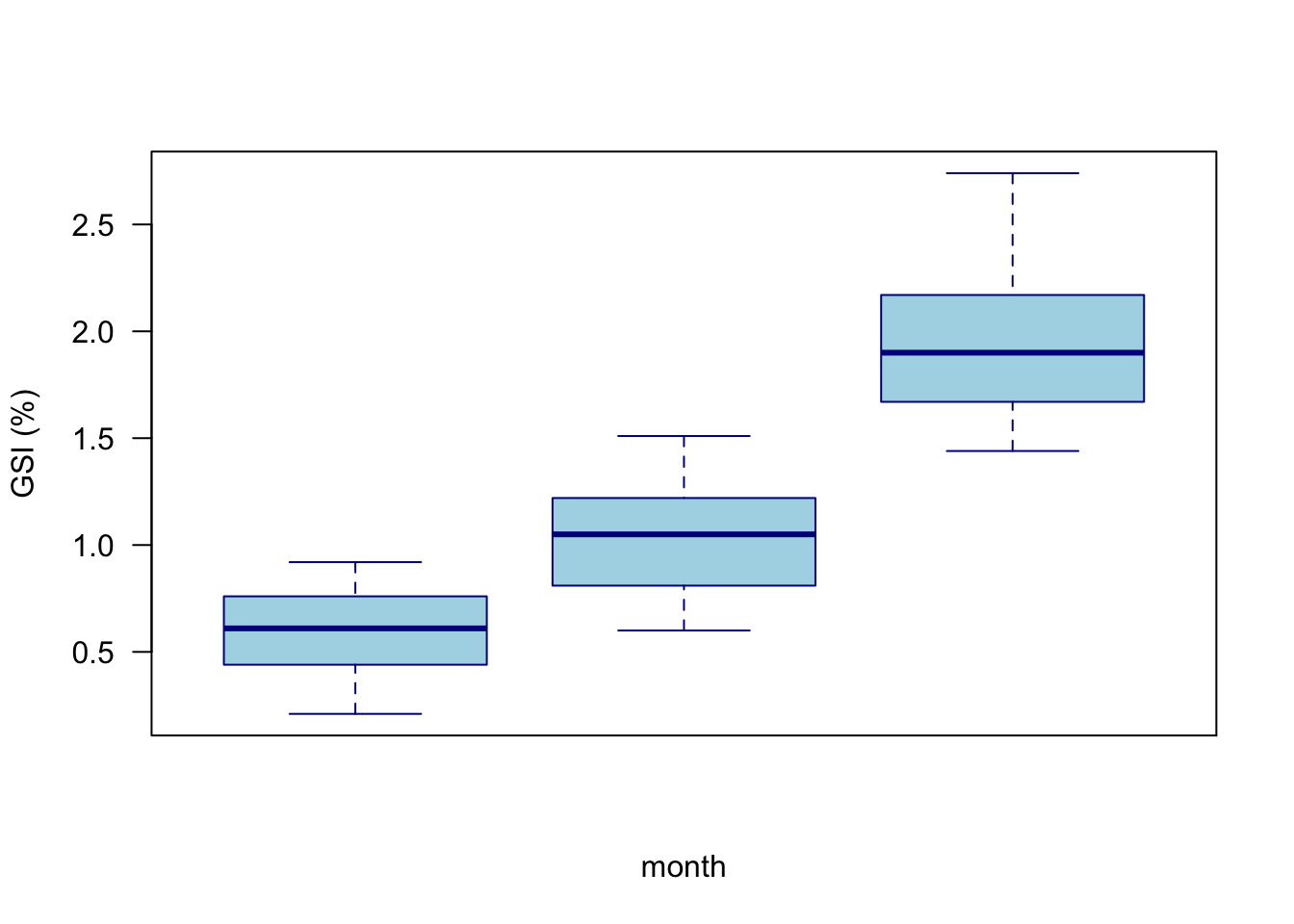 Above is a simple scatter plot this plot was made with the code plot(GSI ~ TL), but could also be made with plot(TL, GSI).
