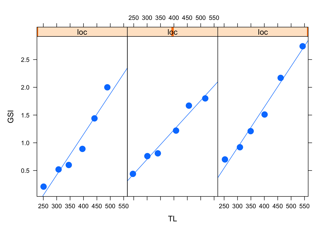 In the code below, we load the library, and use the xyplot() function to specify the GSI and TL relationship we want, but in this case is followed by | loc, which means we specifies separate panels for each location. The "p" and "r" tell the function we want points and a regression line to be included.
