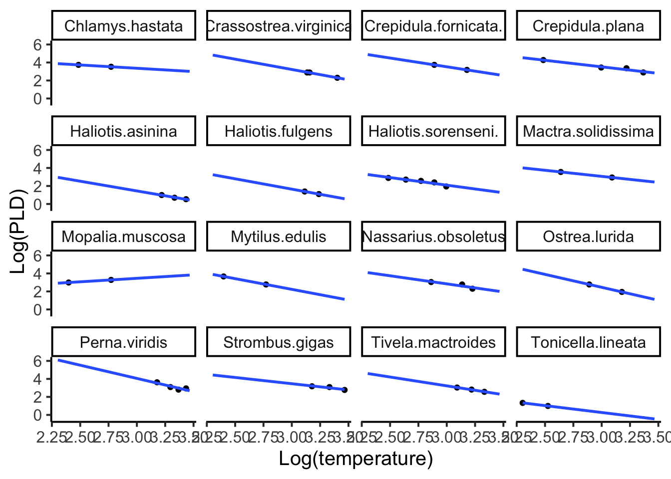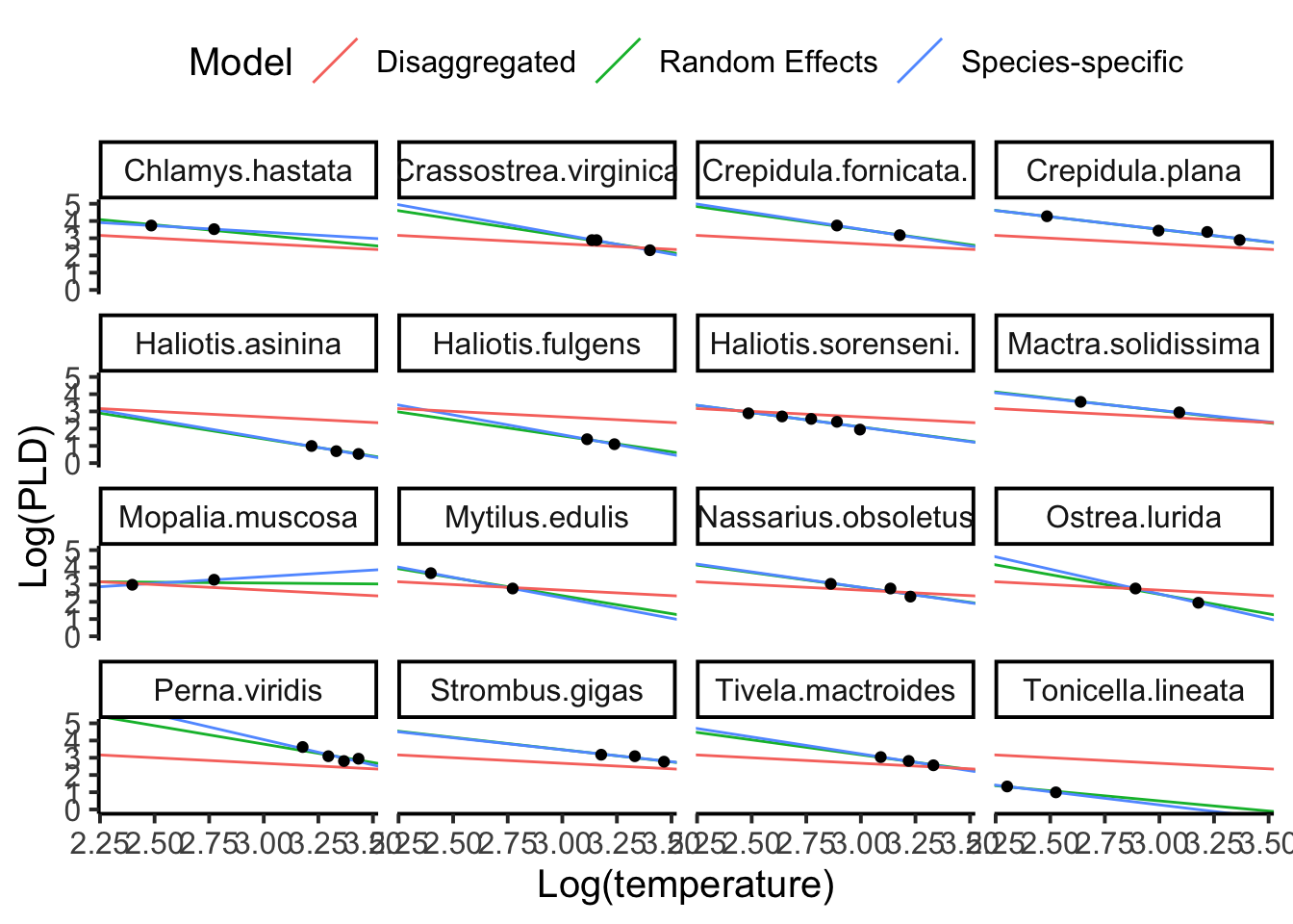 Let’s bring the PLD data back for some model fitting. For the sake of simplicity and space, let’s subset the pld data down to just phylum Mollusca, which still includes 16 species, but helps us focus on specific groups (and avoid 72 panels in a plot).