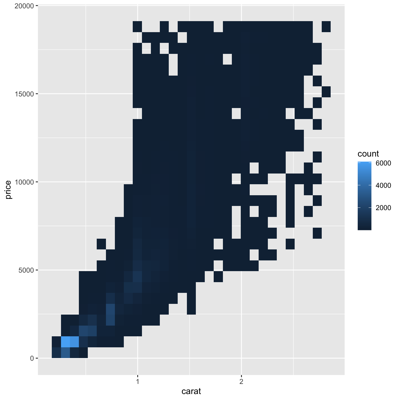 geom_bin2d(mapping = aes(x = carat, y = price))