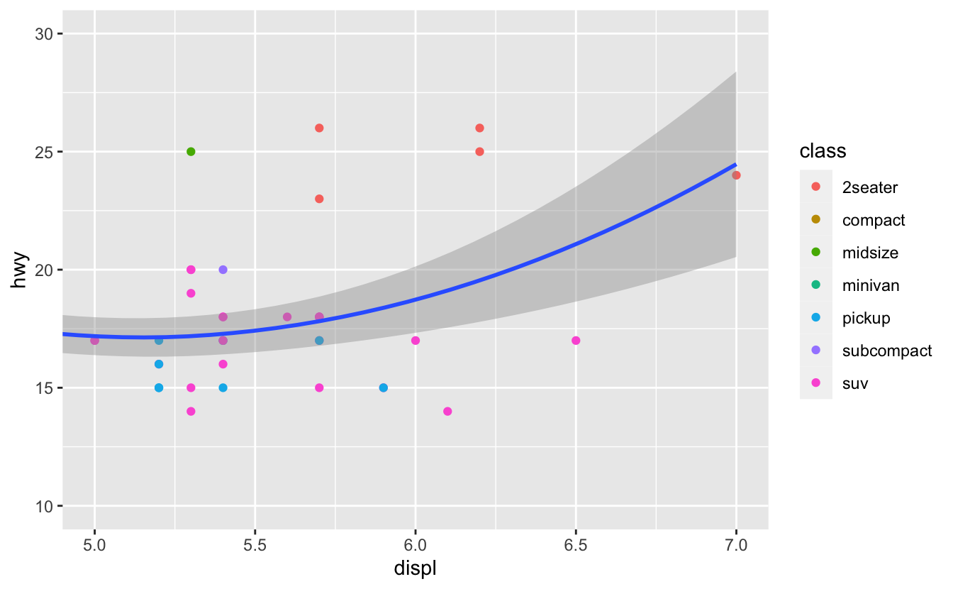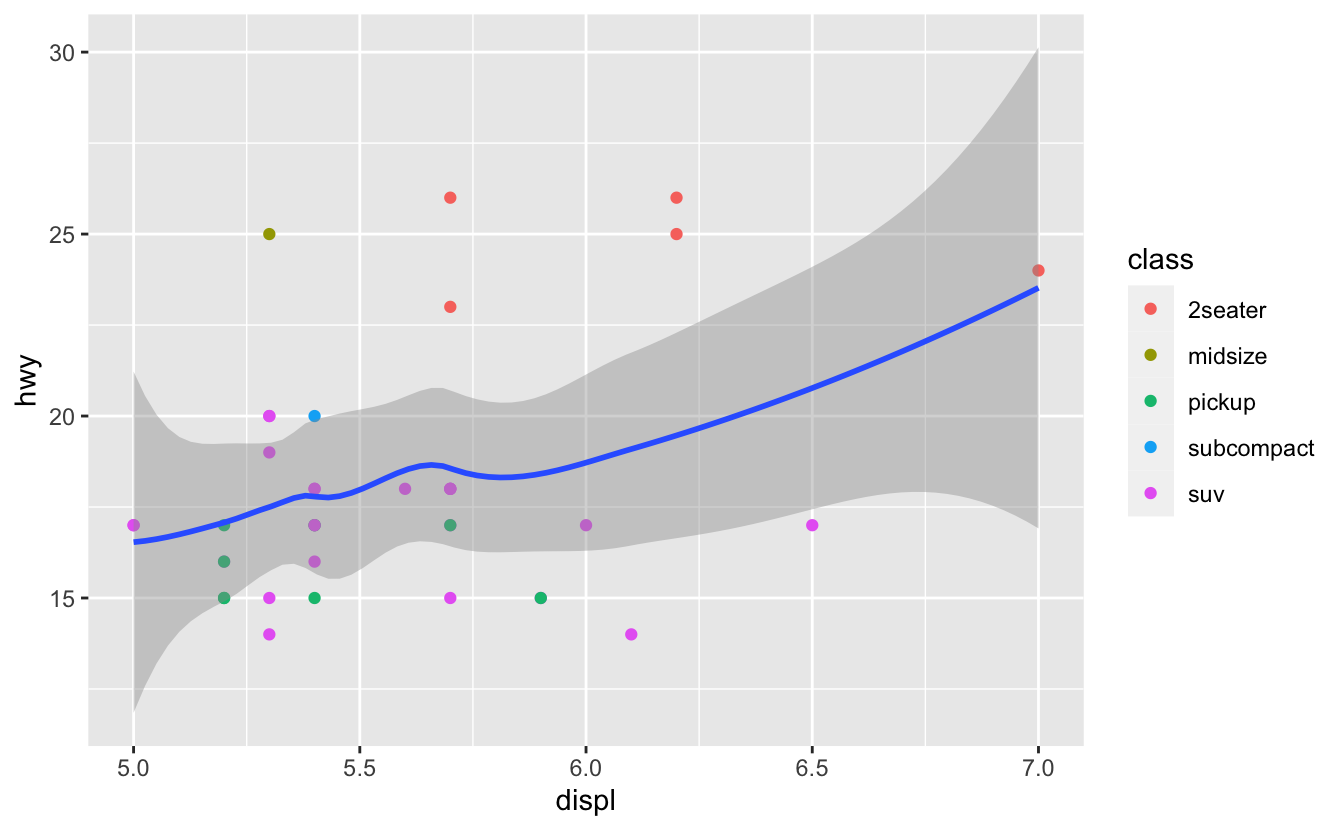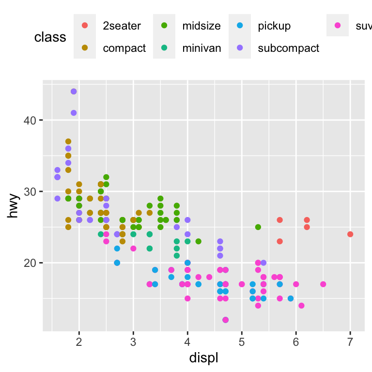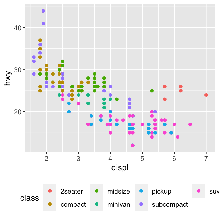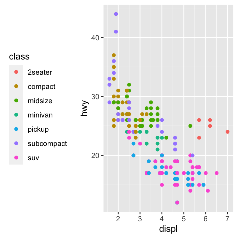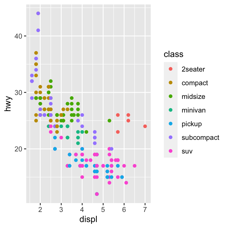 ggplot(mpg, aes(displ, hwy, colour = class)) +