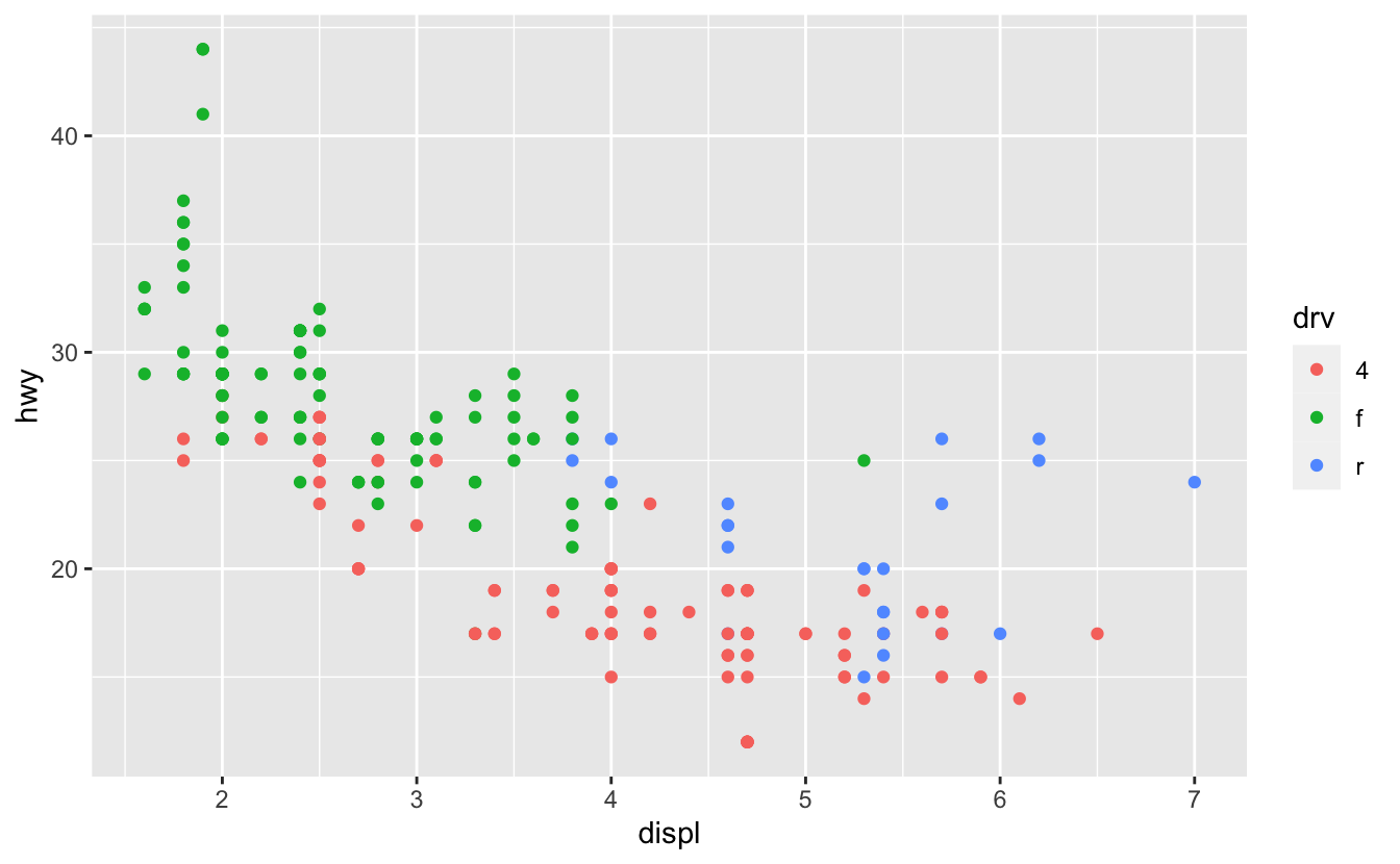 ggplot(suv, aes(displ, hwy, colour = drv)) +