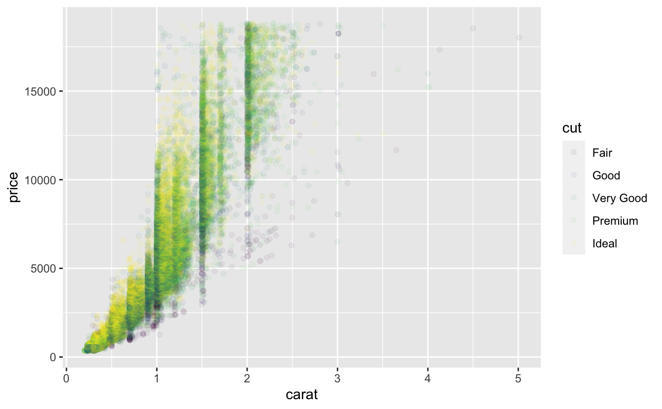 override.aesto make the legend on the following plot easier to see.ggplot(diamonds, aes(carat, price)) + geom_point(aes(colour = cut), alpha = 1/20)