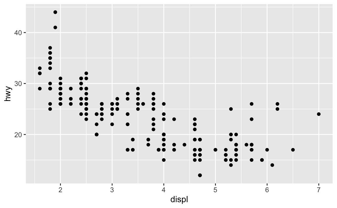 ggplot(mpg, aes(displ, hwy)) + geom_point()