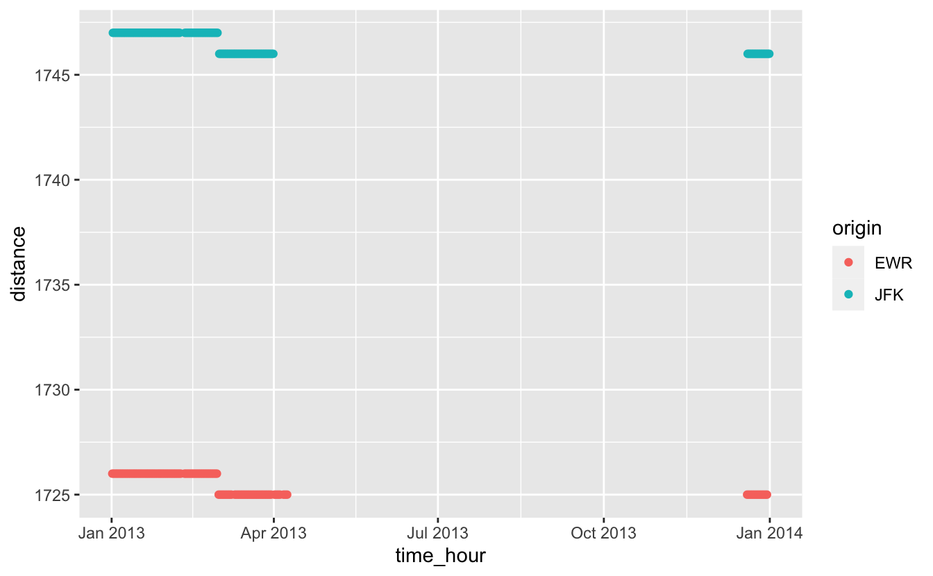 sd(x),IQR(x),mad(x). 평균제곱편차, 혹은 표준편차(standard deviation)인sd(x)는 산포의 표준측 정값이다. 사분위범위(interquartile range),IQR(x)과 중위절대편차(median absolute deviation),mad(x)는 이상값이 있을 때 더 유용하고, 로버스트한 대체 측정값들이다.# Why is distance to some destinations more variable than to others? not_cancelled %>% group_by(origin, dest) %>% summarise(distance_sd = sd(distance), n = n()) %>% filter(distance_sd > 0) #> # A tibble: 2 × 4 #> # Groups: origin [2] #> origin dest distance_sd n #> <chr> <chr> <dbl> <int> #> 1 EWR EGE 0.500 106 #> 2 JFK EGE 0.498 101 # Did it move? not_cancelled %>% filter(dest == "EGE") %>% select(time_hour, dest, distance, origin) %>% ggplot(aes(time_hour, distance, colour = origin)) + geom_point()