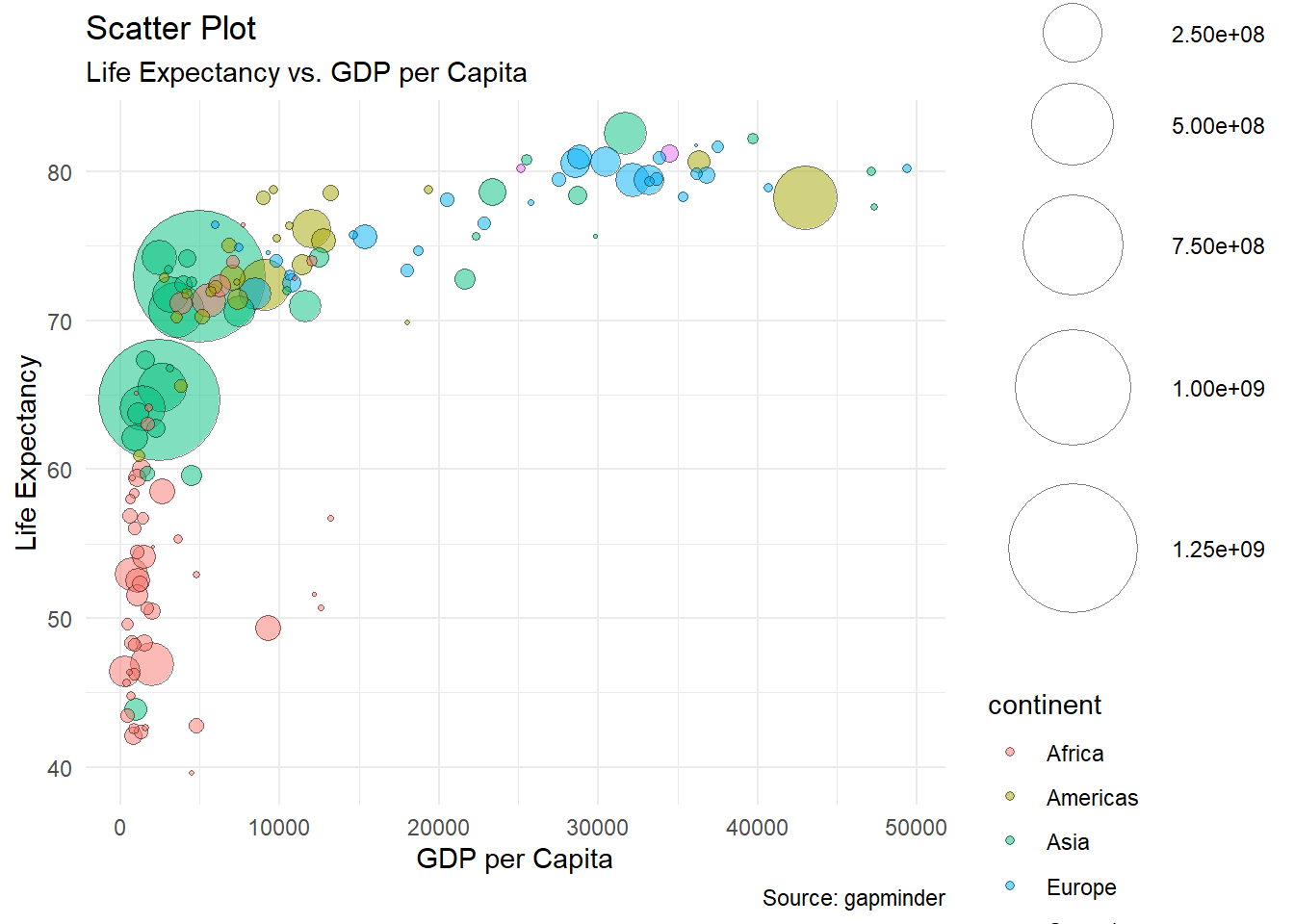 ggplot(data = gdp, mapping = aes(x = gdpPercap, y = lifeExp, size = pop, fill = continent)) +