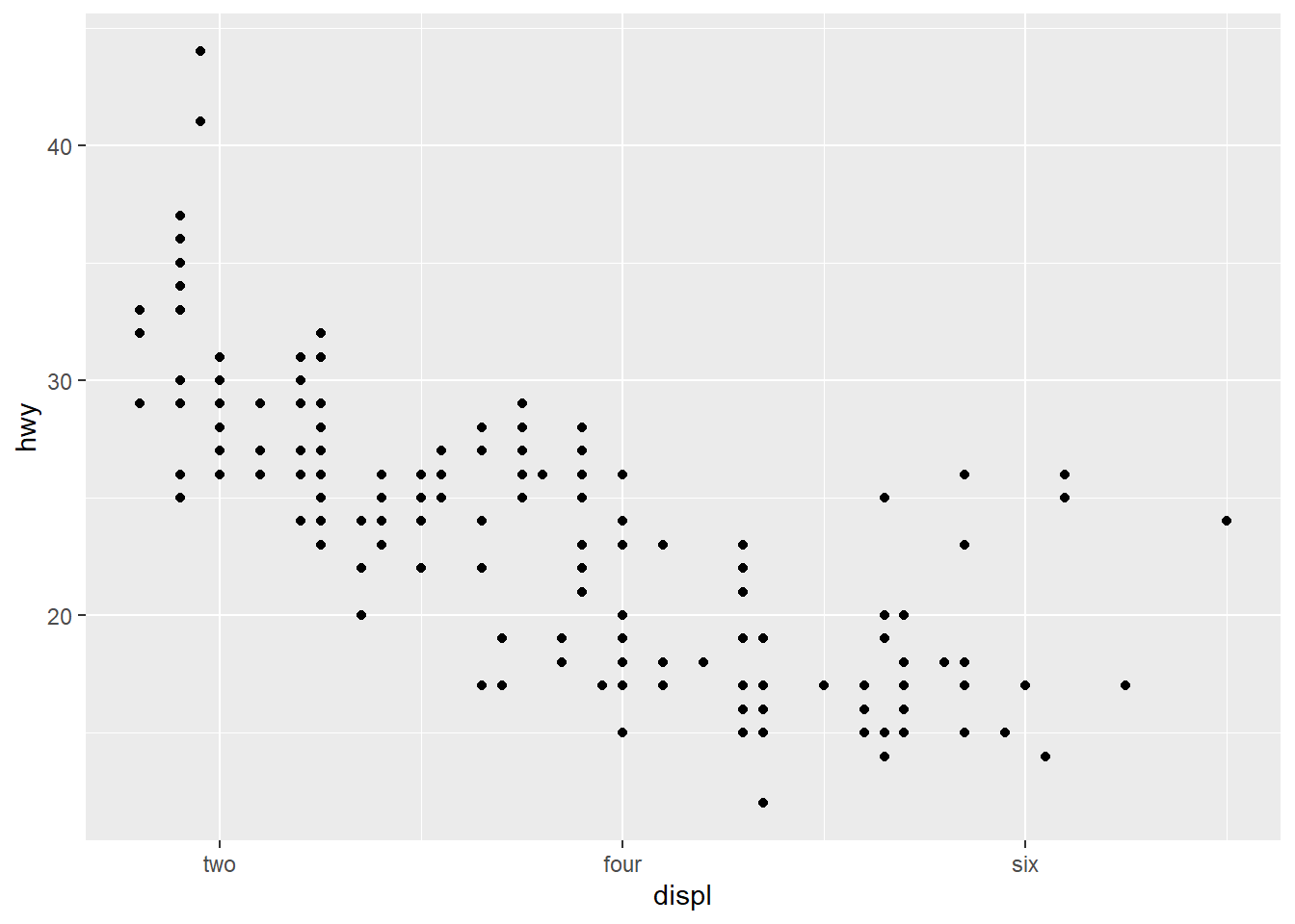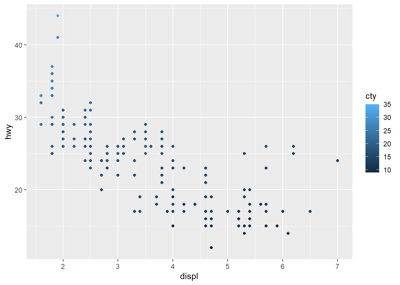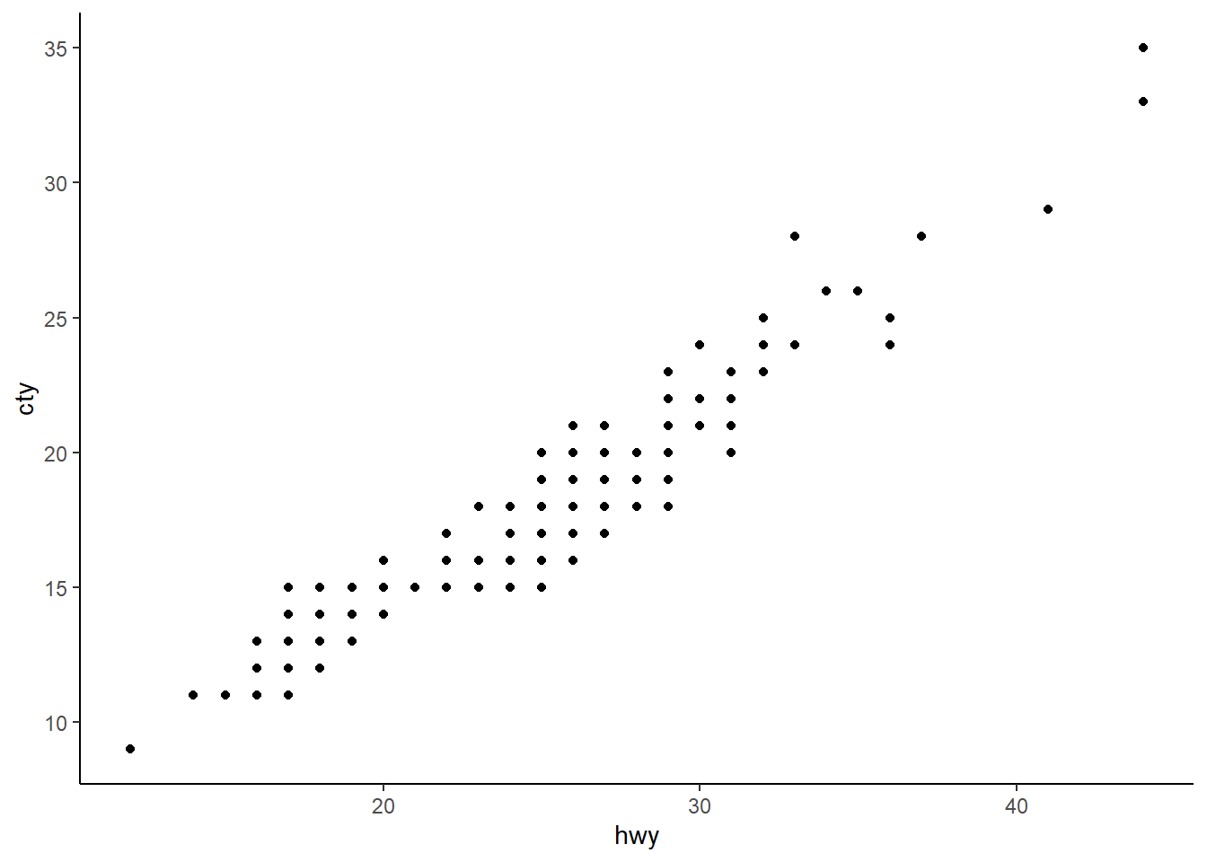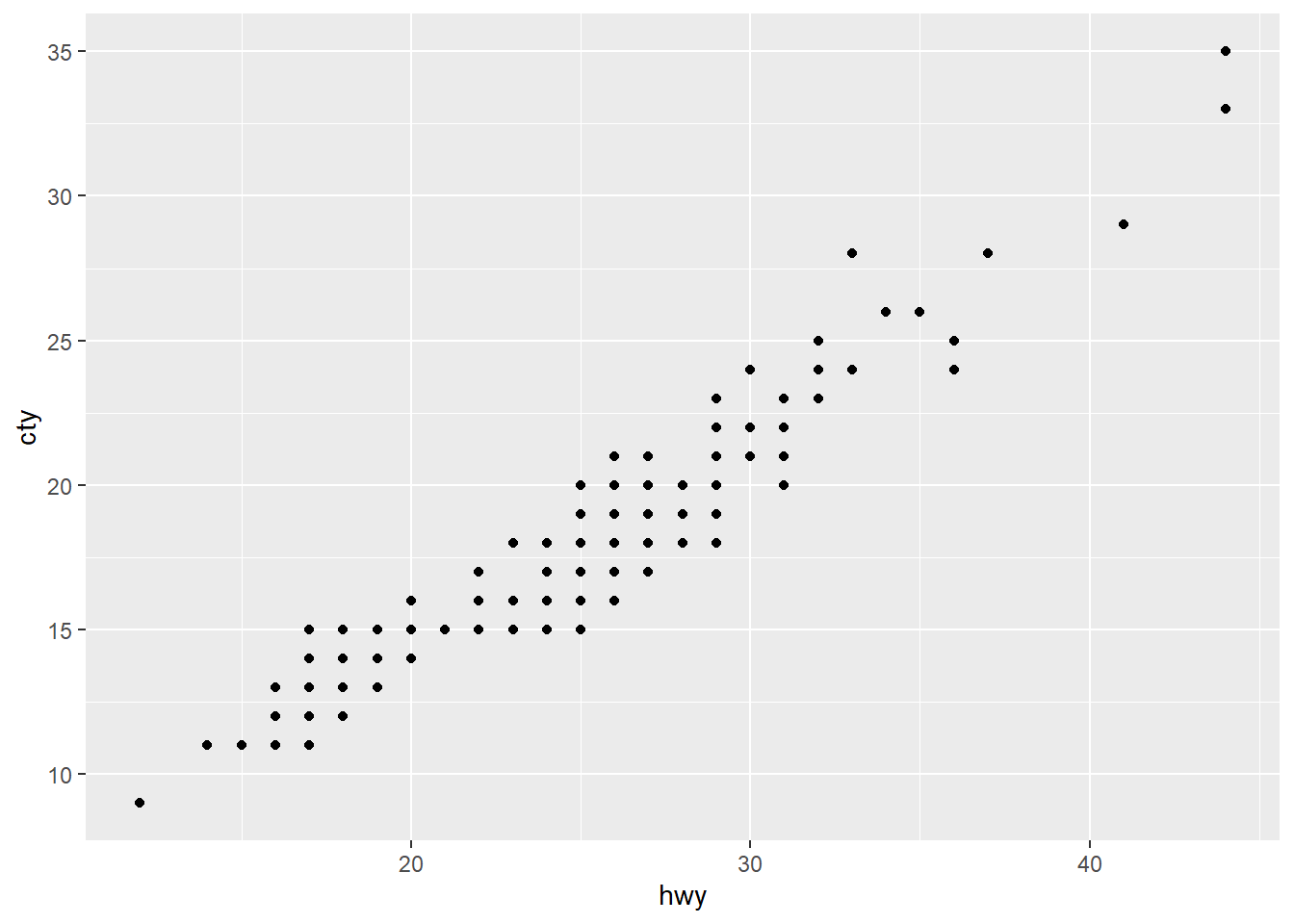 ggplot(mpg, aes(x = hwy, y = cty)) + geom_point() + theme(panel.background = element_rect(fill = "white", colour = "grey50"))