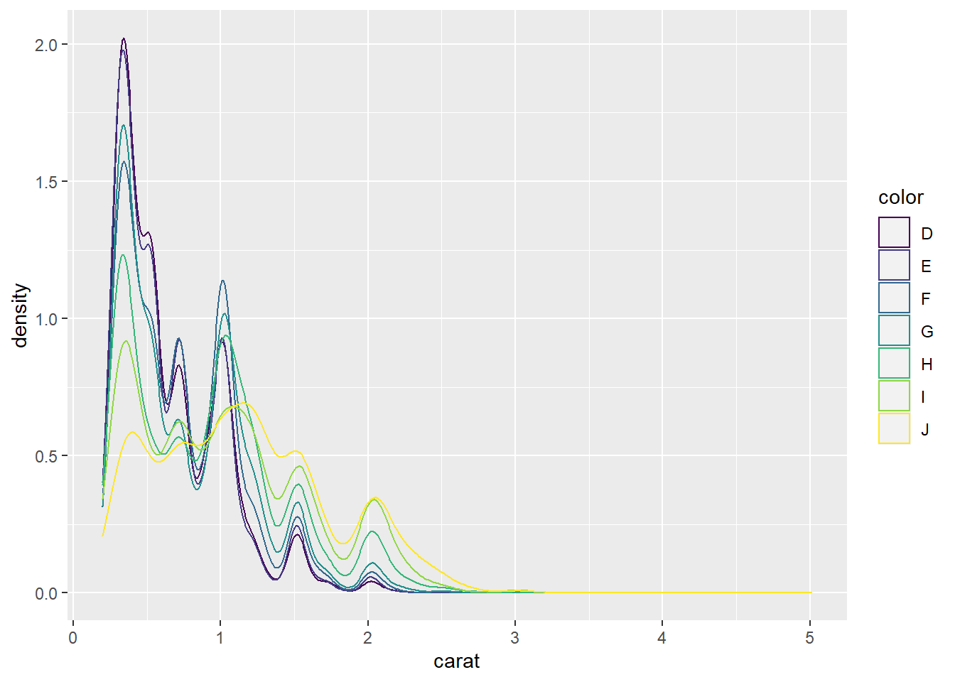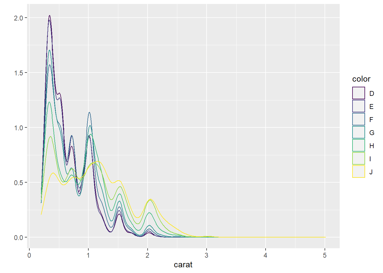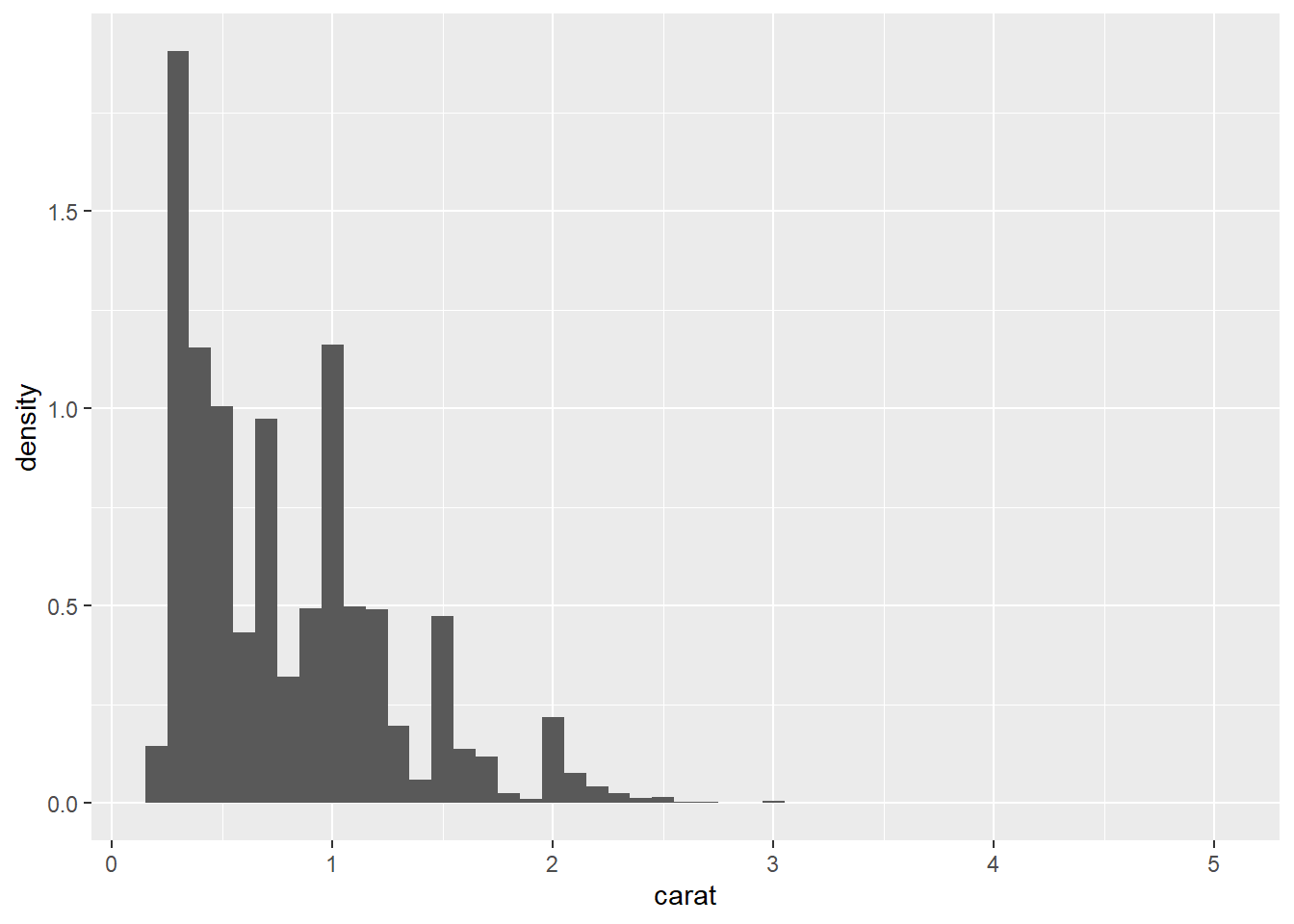 count), but if you’d prefer a more traditional histogram, you can use the density (density). The following example shows a density histogram of carat from the diamonds dataset.” [@wickham2016ggplot2]