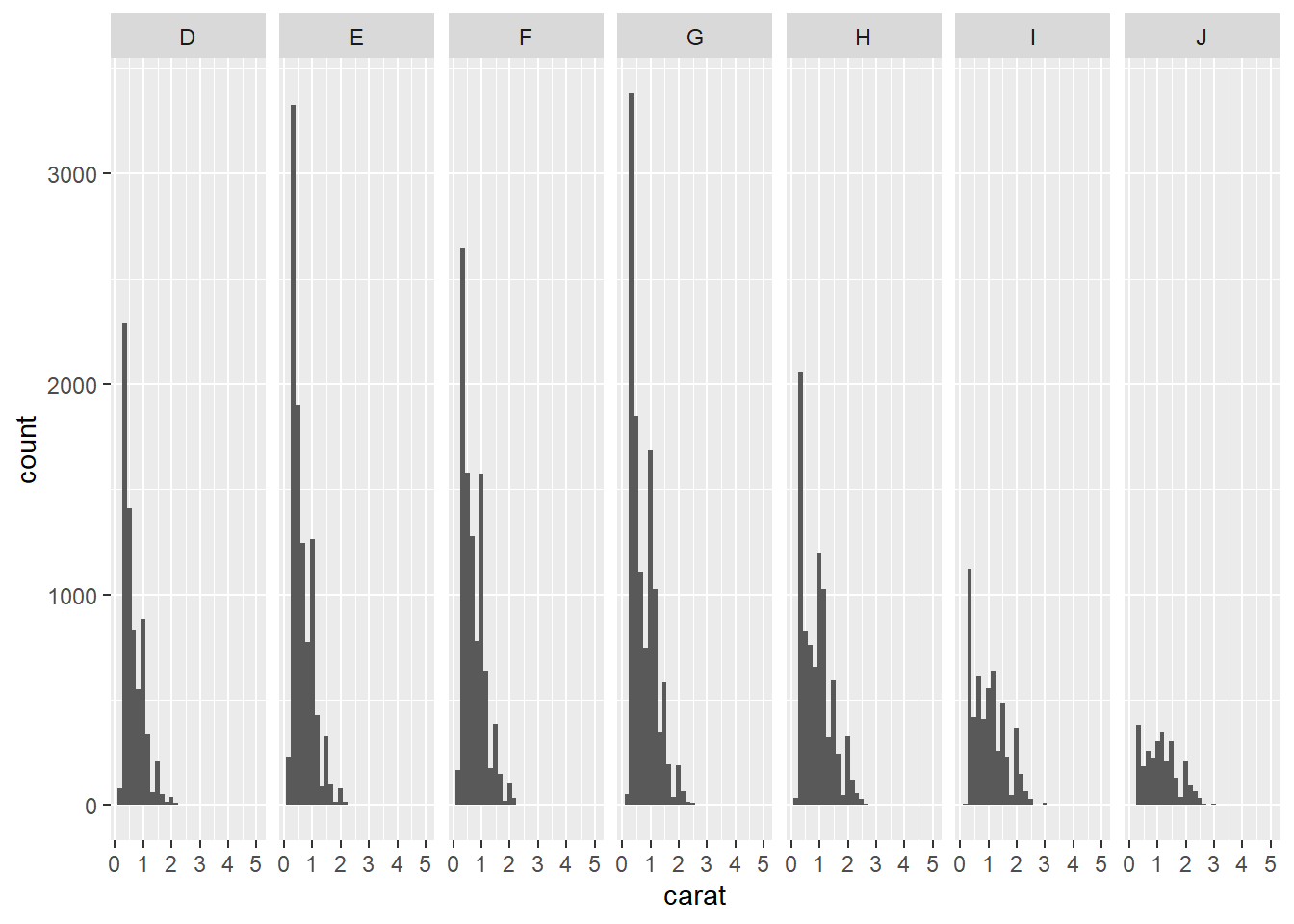 ggplot(data = diamonds, aes(x = carat)) + geom_histogram() + facet_grid(rows = vars(color))## `stat_bin()` using `bins = 30`. Pick better value with `binwidth`.