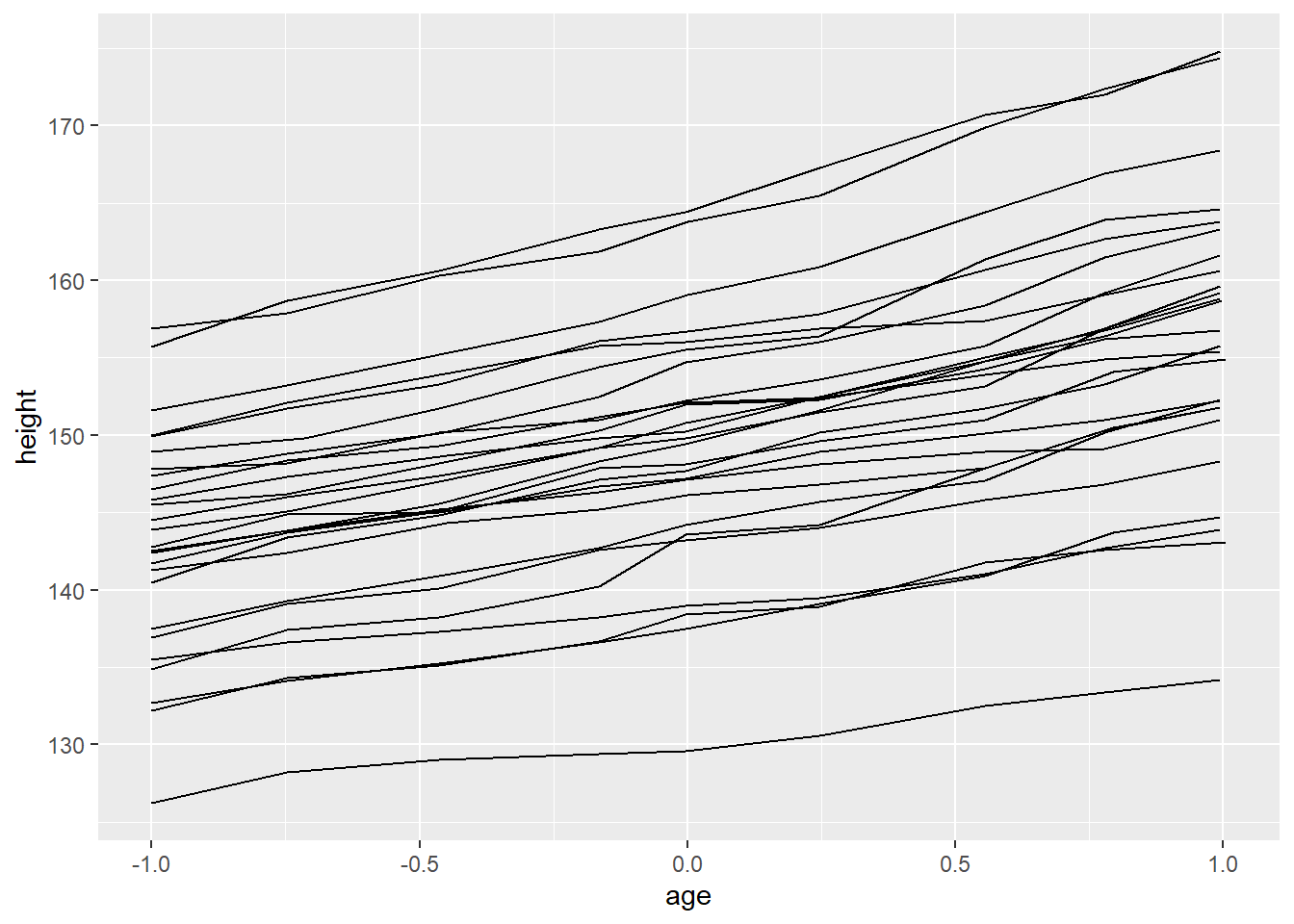 ggplot(Oxboys, aes(age, height, group = Subject)) + geom_line()