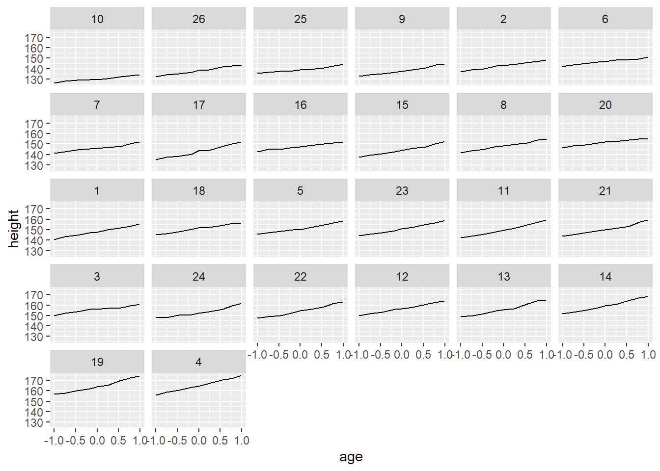 ggplot(Oxboys, aes(age, height)) + geom_line() + facet_wrap(vars(Subject))
