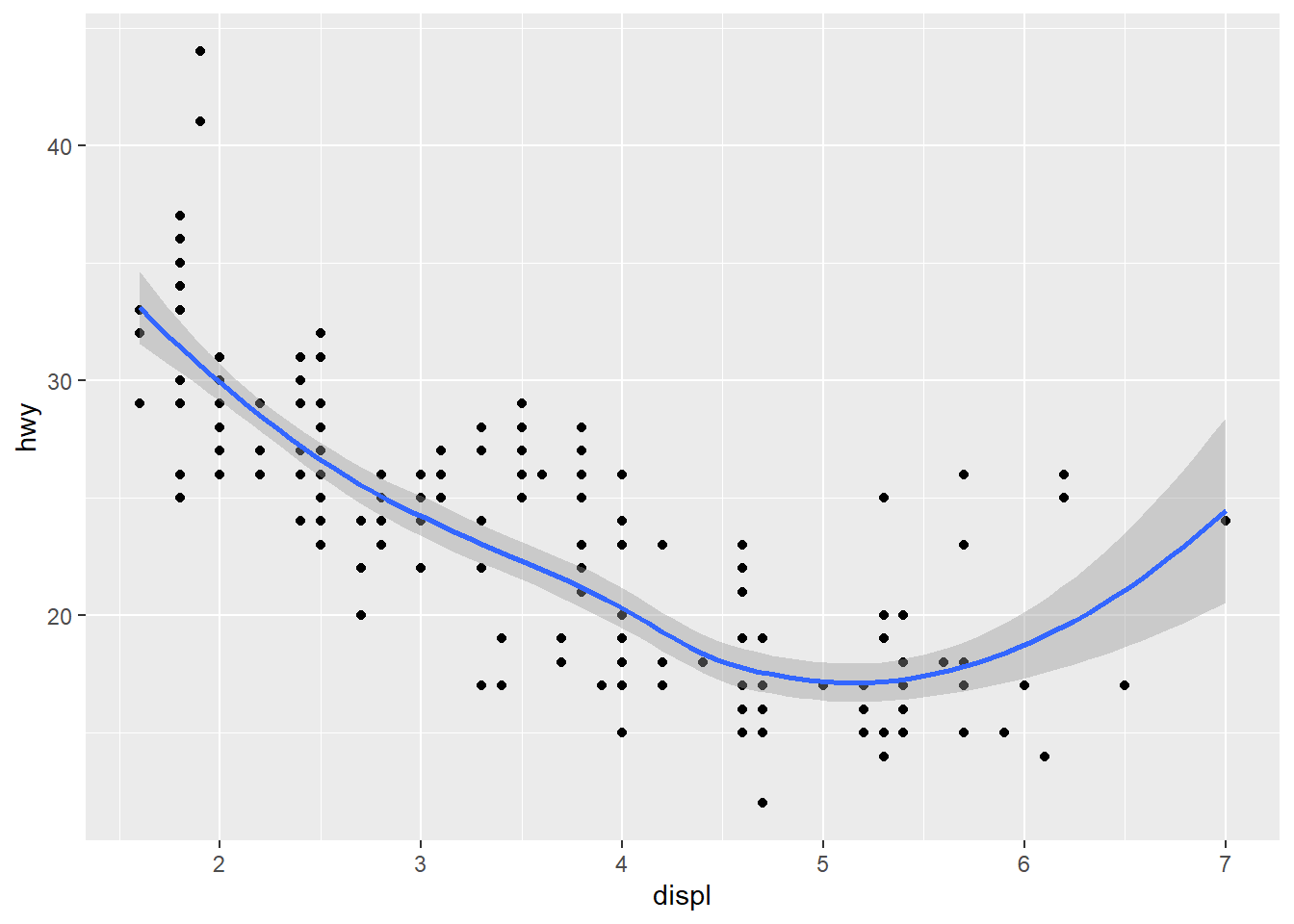 qplot(displ, hwy, data = mpg, geom = c("point", "smooth")) ## `geom_smooth()` using method = 'loess' and formula 'y ~ x'