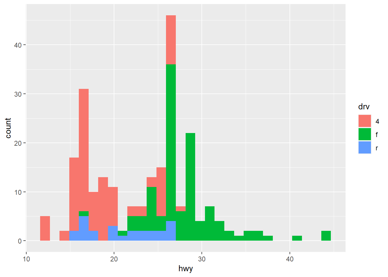 stat_bin, the statistic used to make histograms, produces the following variables:count, the number of observations in each bindensity, the density of observations in each bin (percentage of total / bar width)x, the centre of the bin" [@wickham2016ggplot2]
