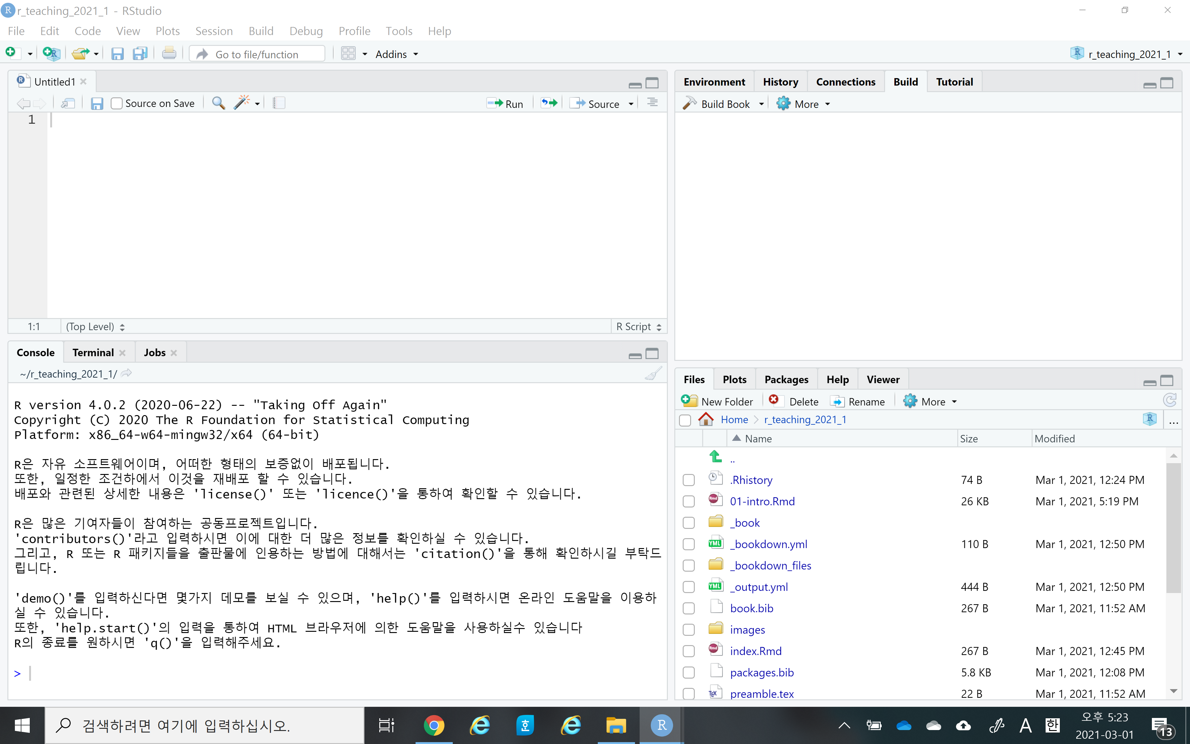 - 구글이나 네이버가 가셔서 “RStudio 한글 설치” 이런정도의 키워드로 검색을 해보시면 RStudio설치시 한글과의 충돌로 인한 문제점에 대한 많은 문서들을 발견할 수 있습니다. 문제가 생기면 우선 구글이나 네이버 검색을 통해서 해결해 보시기 바랍니다. 수강인원이 200명이 넘는 대형강의이기 때문에 조교 선생님들이나 제가 최선을 다해서 도와드리겠지만, 하나하나 수강생들의 특수한 경우에 모두 해결책을 제시해 드리기 힘든점 양해 부탁드립니다.