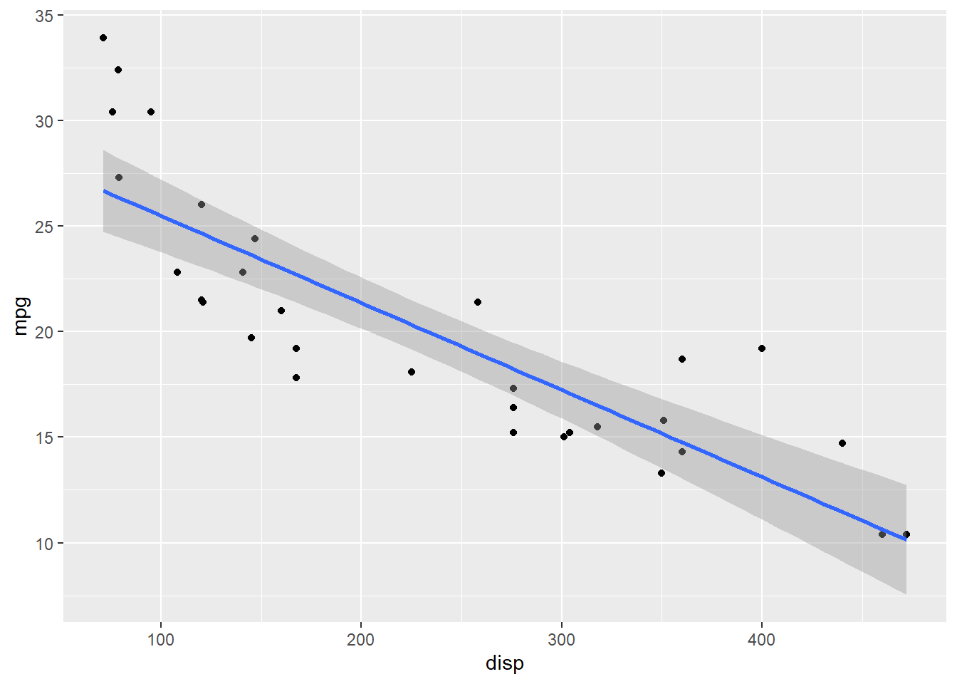 ggplot(mtcars, aes(x = disp, y = mpg)) + geom_point() + geom_smooth(method = "lm")## `geom_smooth()` using formula 'y ~ x'