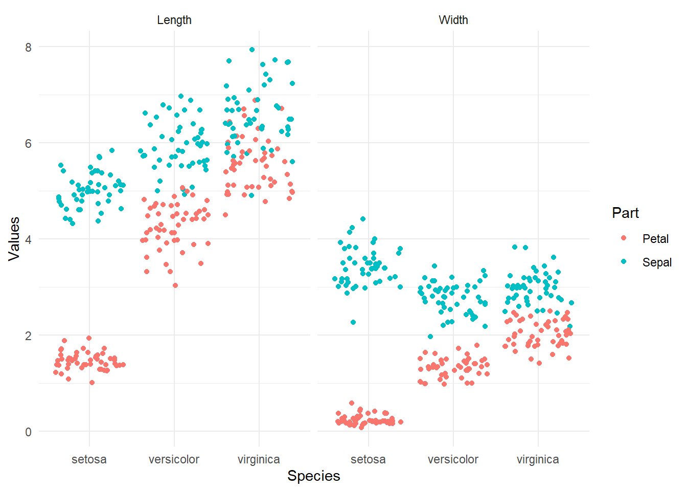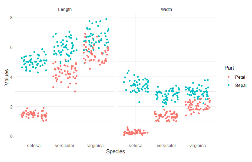 ggplot(aes(x = Species, y = Values, color = Part)) +