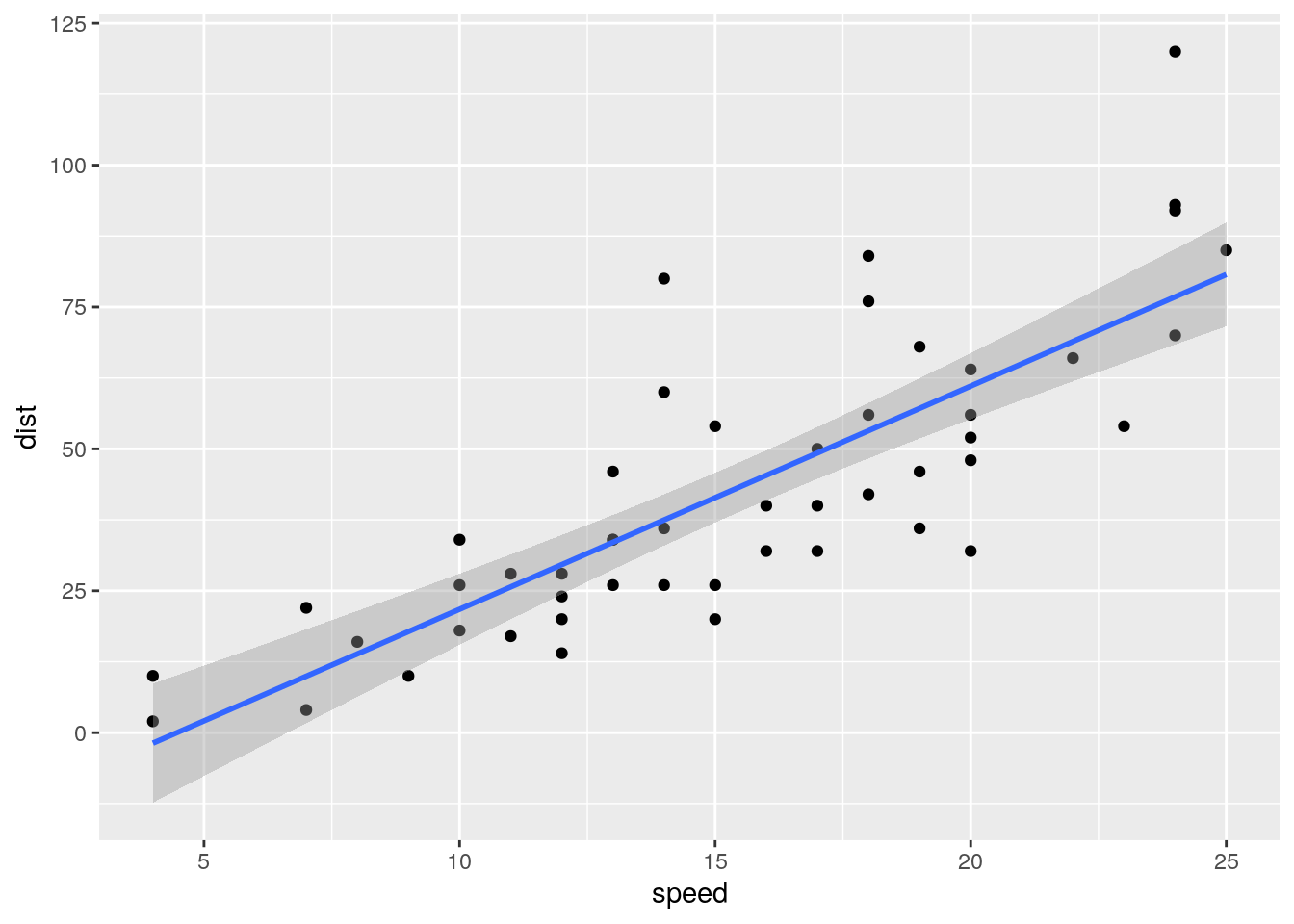 ggplot(data = cars, aes(x = speed, y = dist)) +