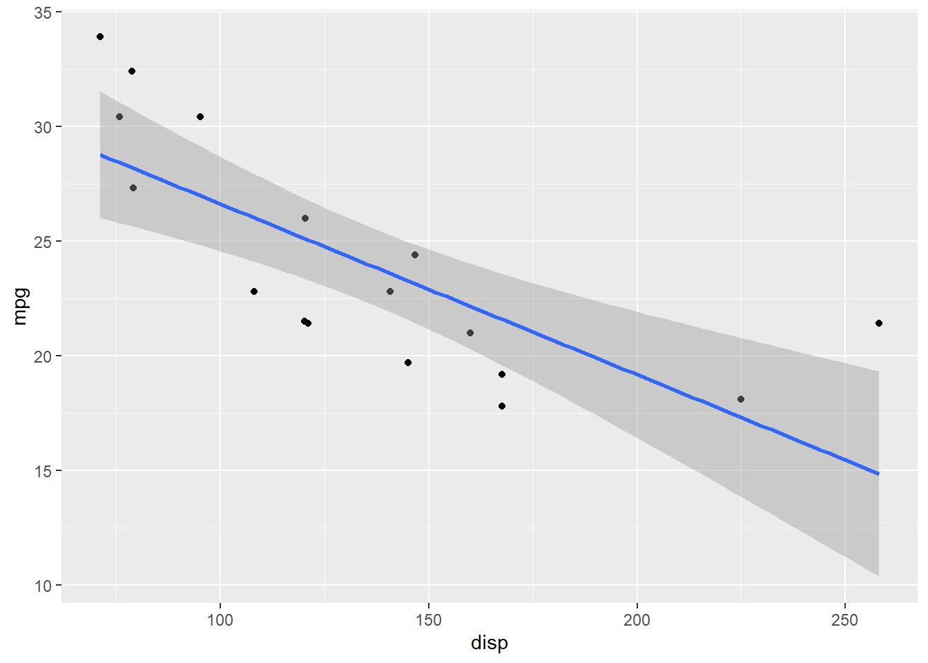 ggplot(aes(x = disp, y = mpg)) + geom_point() + geom_smooth(method = "lm")## `geom_smooth()` using formula 'y ~ x'