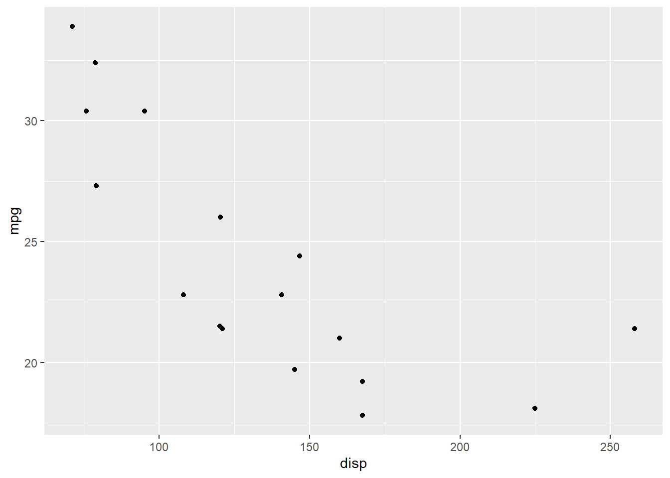 ggplot(aes(x = disp, y = mpg)) + geom_point()