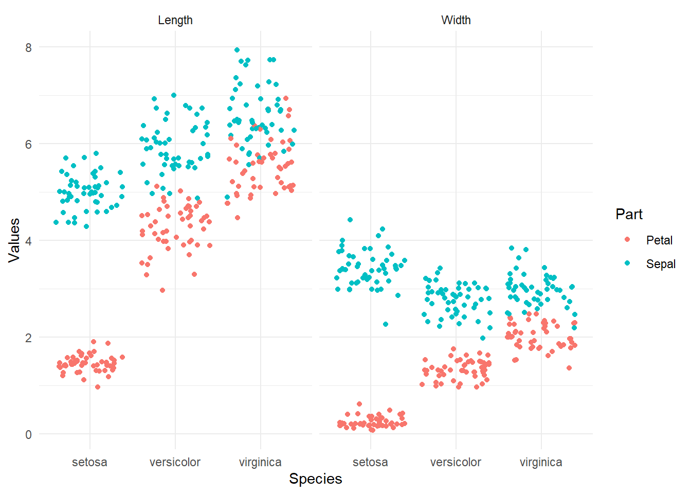 pivot_longer(cols = -Species, names_to = "Measures", values_to = "Values") %>%
