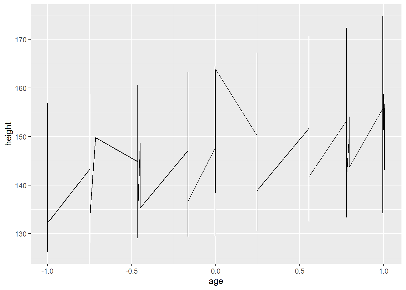 ggplot(Oxboys, aes(age, height)) + geom_line()