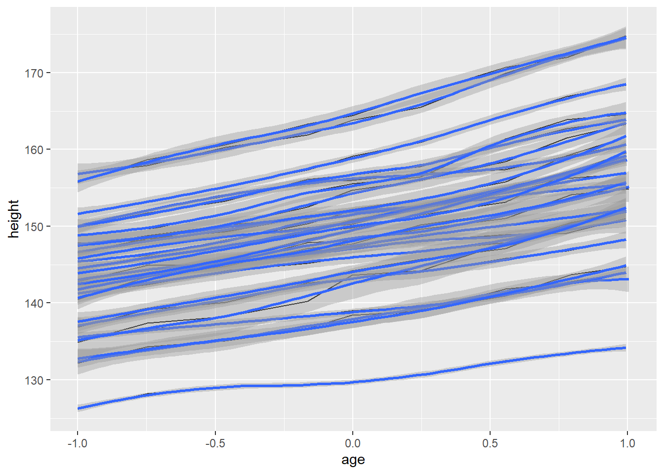 ggplot(Oxboys, aes(age, height, group = Subject)) + geom_line() + geom_smooth()## `geom_smooth()` using method = 'loess' and formula 'y ~ x'