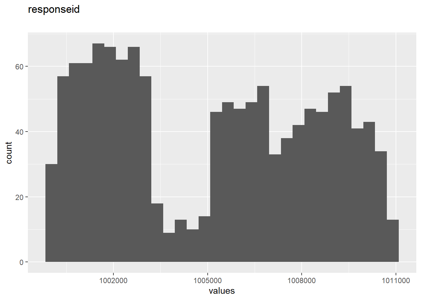 | responseid | numeric | 0 | 1 | 1e+06 | 1e+06 | 1e+06 | 1005121 | 3326 | ▇▅▅▆▆ | F8.2 | NA |