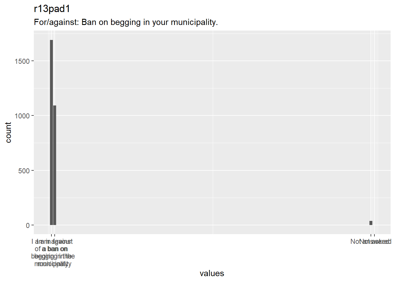 "value": "1. I am in favour of a ban on begging in the municipality,\n2. I am against a ban on begging in the municipality,\n97. Not answered,\n98. Not asked",