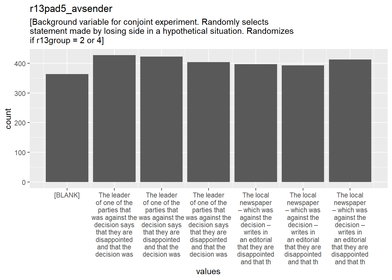 "description": "[Background variable for conjoint experiment. Randomly selects statement made by losing side in a hypothetical situation. Randomizes if r13group = 2 or 4]\r\n",